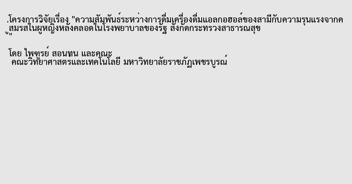 เป็นการศึกษาแบบเชิงวิเคราะห์แบบภาคตัดขวาง (Cross-sectional analytical study) มีวัตถุประสงค์เพื่อวัดความชุกของการดื่มเครื่องดื่มแอลกอฮอล์ของสามีและความรุนแรงจากคู่สมรสและทดสอบความสัมพันธ์ระหว่างการดื่มเครื่องดื่มแอลกอฮอล์ของสามีกับความรุนแรงจากคู่สมรสในผู้หญิงหลังคลอดที่มารับการคลอดในโรงพยาบาลของรัฐ สังกัดกระทรวงสาธารณสุข เครื่องมือเป็นแบบสอบถาม เก็บรวบรวมข้อมูลโดยการให้ตอบแบบสอบถามด้วยตนเอง ณ แผนกสูตินารีเวชหลังคลอด ในโรงพยาบาลของรัฐ สังกัดกระทรวงสาธารณสุข จังหวัดเพชรบูรณ์ จังหวัดเลยและจังหวัดชัยภูมิ คำนวณขนาดตัวอย่างจากสูตรประมาณค่าสัดส่วน ได้ขนาดตัวอย่าง 1,100 คน ทำการสุ่มตัวอย่างแบบชั้นภูมิและแบบแบ่งกลุ่ม (Stratified and cluster random sampling) ได้โรงพยาบาลทั่วไป โรงพยาบาลชุมชนขนาดใหญ่และขนาดกลาง รวม 8 แห่ง เก็บรวบรวมข้อมูลจากกลุ่มตัวอย่างรวม 1,207 คน คิดเป็นร้อยละ 100 ของเป้าหมาย ใช้สถิติเชิงพรรณนา ได้แก่ ความถี่ ร้อยละ ค่าเฉลี่ยและส่วนเบี่ยงเบนมาตรฐาน และใช้สถิติเชิงอนุมาน ได้แก่ Multiple logistic regression