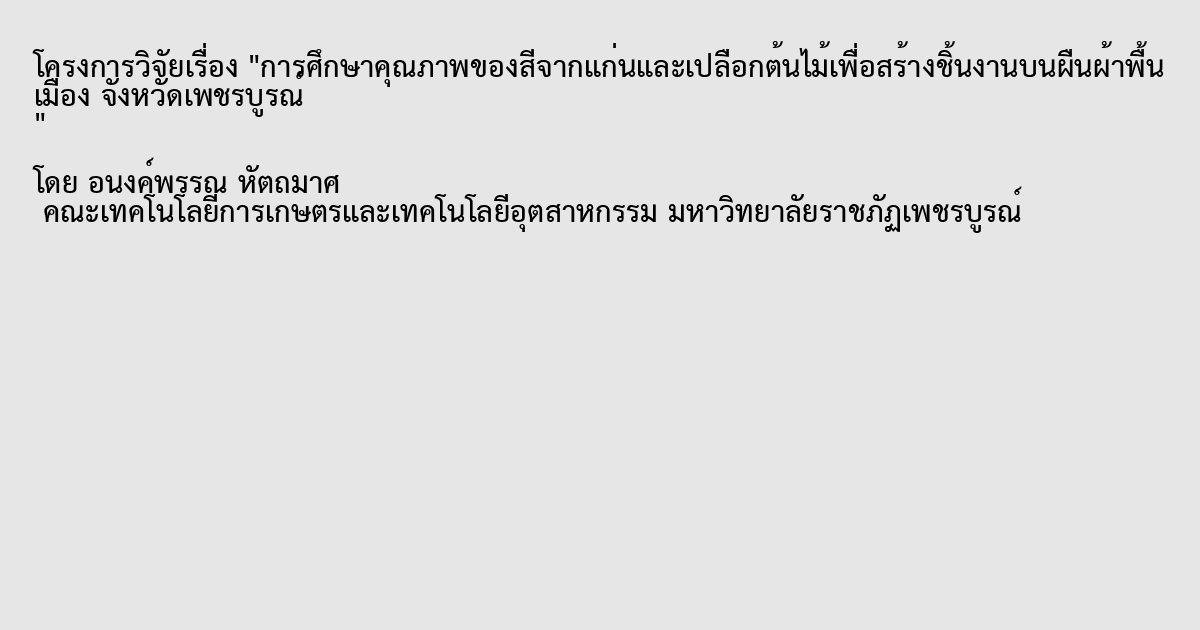 การศึกษาคุณภาพของสีจากแก่นและเปลือกต้นไม้เพื่อสร้างชิ้นงานบนผืนผ้าพื้นเมือง จังหวัดเพชรบูรณ์