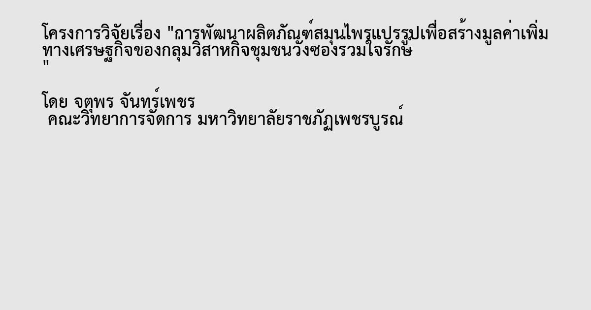 การศึกษาในครั้งนี้มีวัตถุประสงค์ 1) เพื่อศึกษาศักยภาพของกลุ่มวิสาหกิจชุมชนวังซองร่วมใจรักษ์ 2) เพื่อศึกษาแนวทางการพัฒนาผลิตภัณฑ์สมุนไพรแปรรูปของกลุ่มวิสาหกิจชุมชนวังซองร่วมใจรักษ์ โดยการศึกษาและเก็บรวบรวมข้อมูลโดยใช้แบบสัมภาษณ์เชิงลึกกลุ่มวิสาหกิจชุมชนวังซองร่วมใจรักษ์ อำเภอเมือง จังหวัดเพชรบูรณ์ โดยใช้วิธีการวิเคราะห์จุดแข็ง จุดอ่อน โอกาส และอุปสรรค