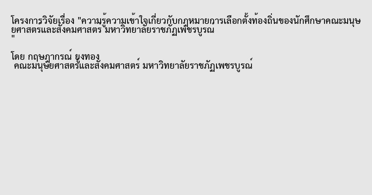 ความรู้ความเข้าใจเกี่ยวกับกฎหมายการเลือกตั้งท้องถิ่นของนักศึกษาคณะมนุษยศาสตร์และสังคมศาสตร์ มหาวิทยาลัยราชภัฏเพชรบูรณ์