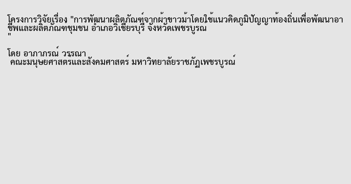 การพัฒนาผลิตภัณฑ์จากผ้าขาวม้าโดยใช้แนวคิดภูมิปัญญาท้องถิ่นเพื่อพัฒนาอาชีพและผลิตภัณฑ์ชุมชน อําเภอวิเชียรบุรี จังหวัดเพชรบูรณ์