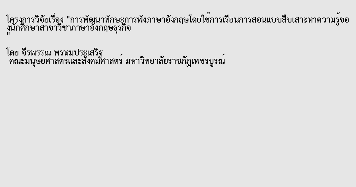 การพัฒนาทักษะการฟังภาษาอังกฤษโดยใช้การเรียนการสอนแบบสืบเสาะหาความรู้ของนักศึกษาสาขาวิชาภาษาอังกฤษธุรกิจ
