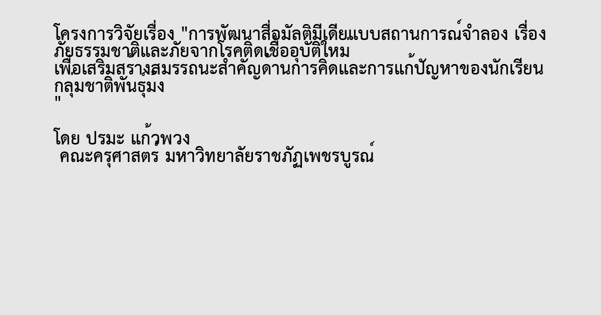 งานวิจัย เรื่อง การพัฒนาสื่อมัลติมีเดียแบบสถานการณ์จาลอง เรื่อง ภัยธรรมชาติและภัยจากโรคติดเชื้ออุบัติใหม่ เพื่อเสริมสร้างสมรรถนะสาคัญด้านการคิดและการแก้ปัญหา ของนักเรียนกลุ่มชาติพันธุ์ม้ง มีวัตถุประสงค์ คือ 1) เพื่อเปรียบเทียบสมรรถนะสาคัญด้านการคิดและการแก้ปัญหา ก่อนเรียนและหลังเรียนโดยสื่อมัลติมีเดียแบบสถานการณ์จาลอง เรื่อง ภัยธรรมชาติ และภัยจากโรคติดเชื้ออุบัติใหม่เพื่อเสริมสร้างสมรรถนะสาคัญด้านการคิดและการแก้ปัญหาของนักเรียนกลุ่มชาติพันธุ์ม้ง และ 2) เพื่อศึกษาความพึงพอใจของของนักเรียนที่มีต่อการเรียนโดยใช้สื่อมัลติมีเดียแบบสถานการณ์จาลอง เรื่อง ภัยธรรมชาติ และภัยจากโรคติดเชื้ออุบัติใหม่เพื่อเสริมสร้างสมรรถนะสาคัญด้านการคิดและการแก้ปัญหาของนักเรียนกลุ่มชาติพันธุ์ม้ง