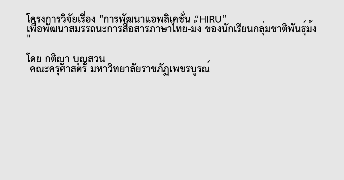 การวิจัยครั้งนี้มีวัตถุประสงค์ เพื่อพัฒนาแอพพลิเคชั่น “HIRU” เพื่อพัฒนาสมรรถนะสำคัญด้านการสื่อสารภาษาไทย-ม้ง ของนักเรียนกลุ่มชาติพันธุ์ม้ง เปรียบเทียบสมรรถนะสำคัญสมรรถนะสำคัญด้านการสื่อสารภาษาไทย-ม้ง ของนักเรียนกลุ่มชาติพันธุ์ม้ง ก่อนใช้และหลังใช้ด้วยแอพพลิเคชั่น “HIRU” ที่พัฒนาขึ้น รวมถึงประเมินความพึงพอใจของของนักเรียนกลุ่มชาติพันธุ์ม้ง หลังใช้ด้วยแอพพลิเคชั่น “HIRU” โดยมีกลุ่มเป้าหมาย คือนักเรียนระดับชั้นประถมศึกษาปีที่ 1 - 3 โรงเรียนบ้านเข็กน้อย สำนักงานเขตพื้นที่การศึกษาประถมศึกษาเพชรบูรณ์ เขต 2 ปีการศึกษา 2566 จำนวนทั้งสิ้น 15 คน เครื่องมือที่ใช้ในการวิจัยคือ แบบประเมินสมรรถนะสำคัญด้านการสื่อสารภาษาไทย-ม้ง และแบบประเมินความพึงพอใจของของนักเรียนกลุ่มชาติพันธุ์ม้ง หลังใช้ด้วยแอพพลิเคชั่น “HIRU” ในงานวิจัยครั้งนี้ใช้การวิเคราะห์ข้อมูลการวิเคราะห์ข้อมูลใช้การวิเคราะห์เชิงเนื้อหา ร่วมกับค่าสถิติอย่างง่าย พบว่า นักเรียนที่ได้รับการจัดกิจกรรมการเรียนรู้ โดยใช้แอพพลิเคชั่น “HIRU” เพื่อพัฒนาสมรรถนะสำคัญด้านการสื่อสารระหว่างภาษาไทย - ม้ง หลังการจัดกิจกรรมการเรียนรู้โดยใช้ มีความพึงพอใจอยู่ในระดับดีมาก ทั้งนี้อาจเป็นเพราะ แอพพลิเคชั่น “HIRU” ที่ผู้วิจัยได้พัฒนาขึ้นมีความ แปลกใหม่ น่าสนใจ เนื้อหาไม่ง่ายหรือไม่ยากจนเกินไป รวมถึงการใช้งานไม่ว่าจะใน หรือนอกห้องเรียน ก็มีความสะดวก แต่ยังมีข้อจำกัดบางอย่าง ในการใช้งานแอพพลิเคชัน คือ เครือข่ายอิเตอร์เน็ต หรือสัญญาณโทรศัพท์สมาร์ทโฟนในบริเวณที่ทำการใช้งาน อย่างไรก็ตาม แอพพลิเคชั่น “HIRU” ทำให้นักเรียนเกิดความสนุกสนานและเกิดการเรียนรู้ข้ามภาษาได้ดี