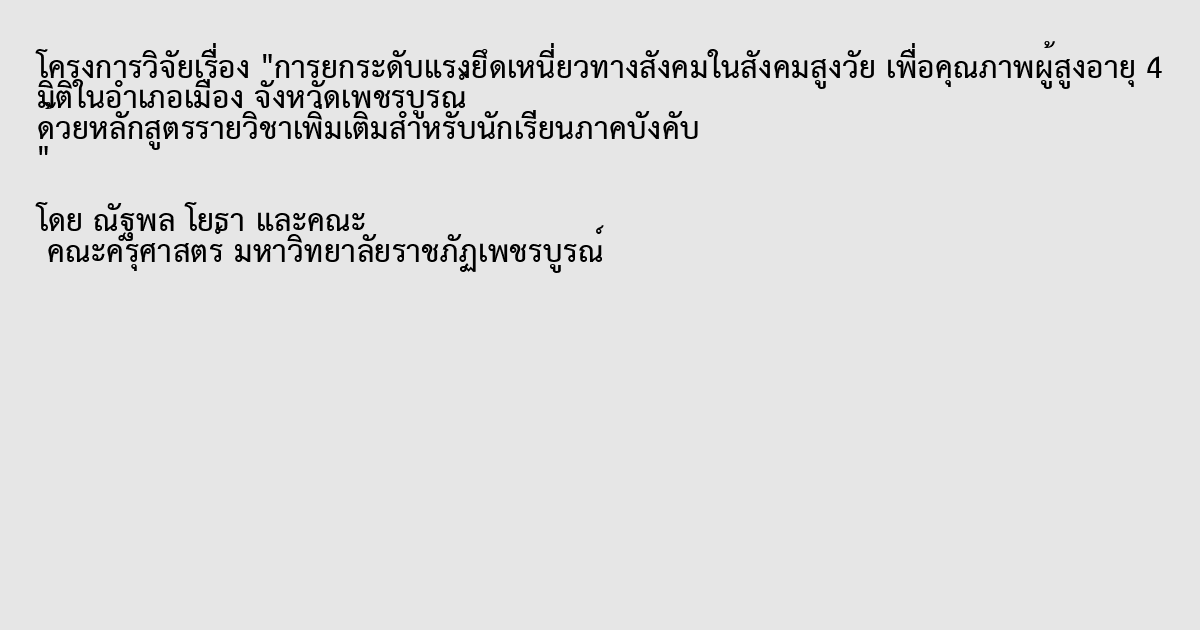 การวิจัยมีวัตถุประสงค์ของการวิจัยเพื่อ 1) ศึกษาความต้องการจำเป็นในการยกระดับแรงยึดเหนี่ยวทางสังคมในสังคมสูงวัยเพื่อคุณภาพผู้สูงอายุ 4 มิติ 2) สร้างหลักสูตรรายวิชาเพิ่มเติม 3) ทดลองนำร่องหลักสูตรรายวิชาเพิ่มเติม 4) ประเมินหลักสูตรรายวิชาเพิ่มเติม