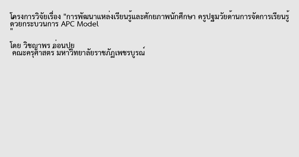 การวิจัยครั้งนี้มีวัตถุประสงค์เพื่อ 1)ศึกษาแหล่งเรียนรู้ภายในชั้นเรียนปัจจุบันและความต้องการแหล่งเรียนรู้ภายในชั้นเรียนระดับปฐมวัย 2)เพื่อสร้างและทดลองใช้รูปแบบการจัดการเรียนรู้ ด้วยกระบวนการ APC Model 3)เพื่อออกแบบและดำเนินการจัดแหล่งเรียนรู้ภายในชั้นเรียนระดับปฐมวัย 4)เพื่อประเมินศักยภาพนักศึกษาด้านการออกแบบการจัดการเรียนรู้ และการจัดสภาพแวดล้อม ภายในชั้นเรียนระดับปฐมวัย และ 5)เพื่อประเมินความพึงพอใจของนักศึกษาครูปฐมวัยหลังได้รับกระบวนการ APC Model และ เพื่อประเมินความพึงพอใจของผู้เกี่ยวข้องที่มีต่อแหล่งเรียนรู้ภายในชั้นเรียนระดับปฐมวัย กลุ่มเป้าหมายคือนักศึกษาสาขาวิชาการศึกษาปฐมวัย คณะครุศาสตร์ มหาวิทยาลัยราชภัฎเพชรบูรณ์ ศึกษาอยู่ชั้นปีที่ 3 ห้อง 1 ภาคเรียนที่ 1 ปีการศึกษา 2566 จำนวน 27 คน ได้มาโดยการเลือกแบบเจาะจง สถิติที่ใช้ในการวิเคราะห์ข้อมูล คือ ค่าเฉลี่ย และค่าเบี่ยงเบนมาตรฐาน