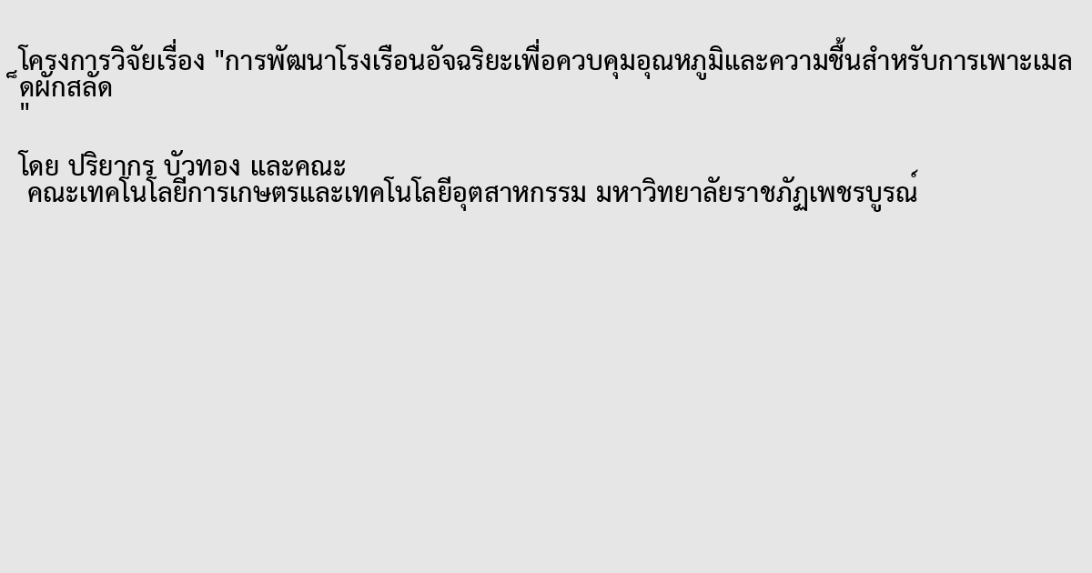 งานวิจัยนี้มีวัตถุประสงค์เพื่อพัฒนาโรงเรือนอัจฉริยะเพื่อควบคุมอุณหภูมิและความชื้นสำหรับการเพาะเมล็ดผักสลัด และเปรียบเทียบประสิทธิภาพการเพาะเมล็ดผักสลัดในโรงเรือนอัจฉริยะกับการเพาะในโรงเรือนปกติ โดยการออกแบบโรงเรือนอัจฉริยะขนาด กว้าง 2 เมตร ยาว 3 เมตร สูง 2 เมตร ออกแบบระบบควบคุมการทำงานของโรงเรือนผ่านไมโครคอนโทรลเลอร์ให้รดน้ำตามค่าความชื้นในดินที่ต้องการ และลดอุณหภูมิด้วยการพ่นหมอก จากการกำหนดค่าของผู้ใช้ผ่านแอปพลิเคชันบนสมาร์ทโฟน และมีระบบเก็บข้อมูลสภาพแวดล้อมในโรงเรือนอัจฉริยะและโรงเรือนปกติผ่านอินเทอร์เน็ต ในการทดลองเพาะเมล็ดใช้ผักสลัด 3 ชนิด คือ เรดโอ๊ค กรีนโอ๊ค และฟินเลย์ไอซ์เบริก เพาะพร้อมกันในโรงเรือนอัจฉริยะและโรงเรือนปกติ เก็บข้อมูลการทำงานของระบบโรงเรือนอัจฉริยะ การงอกของเมล็ด และสภาพแวดล้อมเป็นเวลา 10 วัน