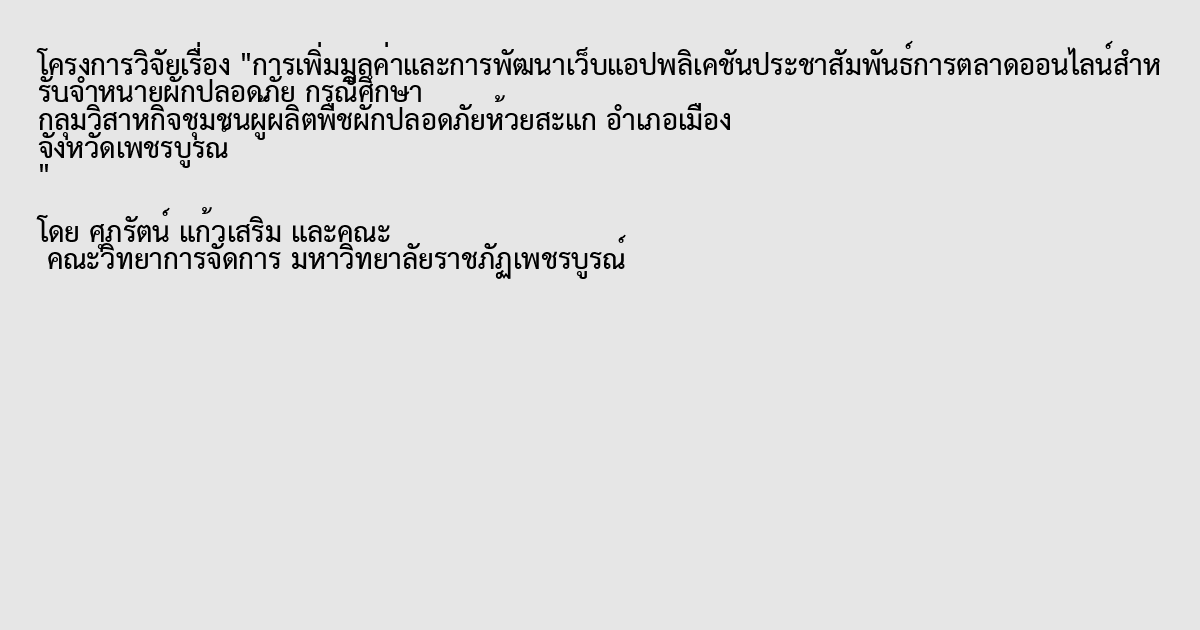 วัตถุประสงค์ในการทำวิจัยนี้ 1) เพื่อเพิ่มมูลค่าผักปลอดภัยที่เหลือทิ้งของกลุ่มวิสาหกิจชุมชนผู้ผลิตพืชผักปลอดภัยห้วยสะแก อำเภอเมืองเพชรบูรณ์ จังหวัดเพชรบูรณ์ 2) เพื่อพัฒนาเว็บแอปพลิเคชันประชาสัมพันธ์การตลาดออนไลน์สำหรับจำหน่ายผักปลอดภัย กรณีศึกษา กลุ่มวิสาหกิจชุมชนผู้ผลิตพืชผักปลอดภัยห้วยสะแก อำเภอเมืองเพชรบูรณ์ จังหวัดเพชรบูรณ์ กลุ่มตัวอย่าง ได้แก่ วิสาหกิจชุมชนผู้ผลิตพืชผักปลอดภัยห้วยสะแก อำเภอเมืองเพชรบูรณ์ จังหวัดเพชรบูรณ์ จำนวน 10 คน โดยวิธีการเลือกแบบเฉพาะเจาะจง และนักท่องเที่ยวที่เดินทางมาท่องเที่ยวในพื้นที่จังหวัดเพชรบูรณ์ที่ทดลองใช้งานเว็บแอปพลิเคชัน โดยวิธีการเลือกแบบบังเอิญ จำนวน 384 คน โดยเก็บข้อมูลระหว่างเดือน พฤษภาคม - สิงหาคม 2566 โดยวิธีการเลือกแบบบังเอิญ