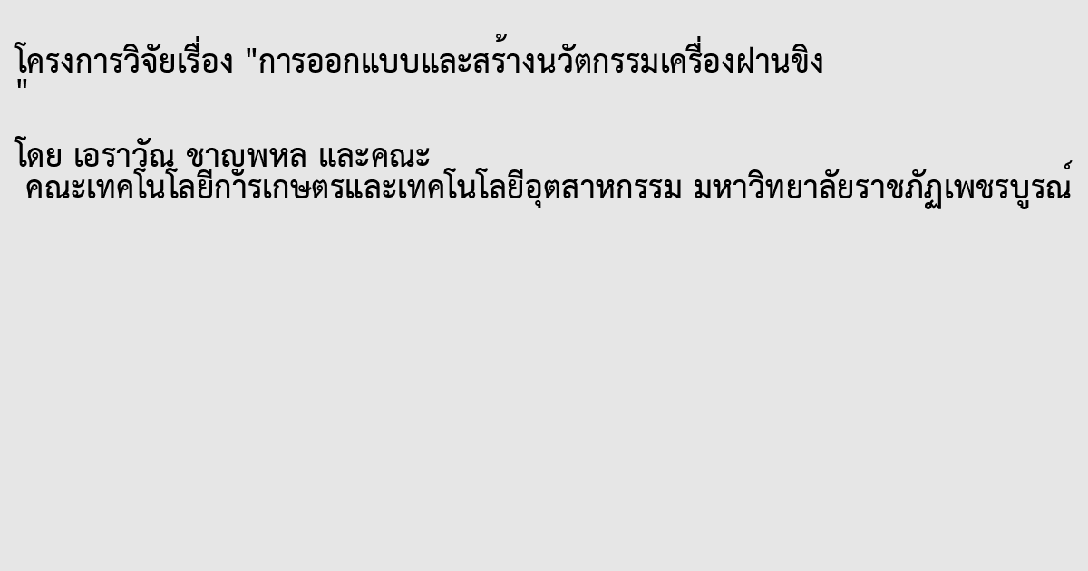 วัตถุประสงค์ของงานวิจัยนี้ เพื่อสร้างและพัฒนาเครื่องฝานขิง สำหรับการฝานขิงแบบเดิมใช้แรงงานคนในการฝานขิง ทำให้เกิดปัญหาคือ เกิดความเมื่อยล้าแก่ผู้ปฏิบัติงานอย่างมาก ใช้เวลามากในการฝานขิง และมีความไม่ปลอดภัยในการทำงาน เครื่องฝานขิงที่พัฒนาขึ้นสามารถฝานขิง และลดเวลาในการฝานขิง ซึ่งโดยปกติแรงงานคนใช้เวลาในการฝานขิง 486 วินาที ต่อ 3 กิโลกรัม ผลการทดลอง พบว่า เครื่องฝานขิงมีอัตราการผลิตเฉลี่ย 81 วินาที ต่อ 3 กิโลกรัม ซึ่งไวกว่าแรงงานคนประมาณ 6 เท่า เมื่อประเมินความพึงพอใจโดยใช้แบบสอบถามกับกลุ่มตัวอย่างเกษตรกรผู้ปลูกฝรั่ง จังหวัดเพชรบูรณ์ จำนวน 20 รายใน 3 ด้าน ประกอบด้วย ด้านการออกแบบ ด้านการใช้งาน และด้านสมรรถนะการผลิต ผลการประเมินเท่ากับ 4.58 จากคะแนนเต็ม 5 ซึ่งอยู่ในระดับเห็นด้วยอย่างยิ่ง