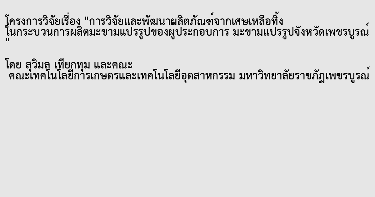 การวิจัยและพัฒนาผลิตภัณฑ์จากเศษเหลือทิ้ง ในกระบวนการผลิตมะขามแปรรูปของผู้ประกอบการ มะขามแปรรูปจังหวัดเพชรบูรณ์