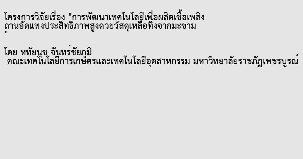 งานวิจัยนี้มีวัตถุประสงค์เพื่อผลิตและทดสอบคุณสมบัติของถ่านอัดแท่งจากวัสดุเหลือทิ้งจากมะขามในอัตราส่วนผงถ่านกิ่งมะขาม: ผงถ่านรกและเปลือกมะขาม : แป้งมันสำปะหลัง : น้ำ ทั้งหมด 22 สูตร ได้แก่ 10: 0: 0.5: 3, 9: 1: 0.5: 3, 8: 2: 0.5: 3, 7: 3: 0.5: 3, 6: 4: 0.5: 3, 5: 5: 0.5: 3, 4: 6: 0.5: 3, 3: 7: 0.5: 3, 2: 8: 0.5: 3, 1: 9: 0.5: 3, 0: 10: 0.5: 3, 10: 0: 1: 3, 9: 1: 1: 3, 8: 2: 1: 3, 7: 3: 1: 3, 6: 4: 1: 3, 5: 5: 1: 3, 4: 6: 1: 3, 3: 7: 1: 3, 2: 8: 1: 3, 1: 9: 1: 3 และ 0: 10: 1: 3 กิโลกรัม ตามลำดับ พบว่าถ่านอัดแท่งจากวัสดุเหลือทิ้งจากมะขามที่พัฒนาขึ้นมาเป็นไปตามข้อกำหนดในมาตรฐานผลิตภัณฑ์ชุมชนถ่านอัดแท่ง (มผช. 238/2547) ทุกประการ นอกจากนี้ยังพบว่าถ่านอัดแท่งจากวัสดุเหลือทิ้งจากมะขามมีประสิทธิภาพการให้ความร้อนที่ดี เมื่อติดไฟไม่มีการเกิดสะเก็ดไฟกระเด็น ควัน และกลิ่นฉุน และยังสามารถให้ความร้อนเป็นระยะเวลาที่ยาวนาน โดยอัตราส่วนในการผลิตถ่านอัดแท่งที่เหมาะสมที่สุดในการผลิต คือ ผงถ่านกิ่งมะขาม: ผงถ่านรกและเปลือกมะขาม : แป้งมันสำปะหลัง : น้ำ ในอัตราส่วน 10 : 0 : 0.5 : 3 กิโลกรัม จากผลการประเมินความพึงพอใจที่มีต่อเชื้อเพลิงถ่านอัดแท่งจากวัสดุเหลือทิ้งจากมะขาม พบว่ามีค่าเฉลี่ยความพึงพอใจเท่ากับ 4.51 ส่วนเบี่ยงเบนมาตรฐานเท่ากับ 0.71 ระดับความพึงพอใจอยู่ในเกณฑ์พึงพอใจมากที่สุด