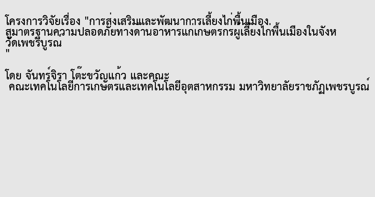 The promoting and development of native chicken production to food safety standards for native chicken farmers in Phetchabun province. A total of 100 native chicken farmers were conducted a survey by questionnaires. The results showed that most of the farmers were male, 69.00 %, aged 60 years or over, 31.00 %, 64.00 % had primary school education, and 61.00 % had experience in raising cattle during 1 to 5 years. Each household has 1-4 members, 74.00 %, Use an area of 100-200 square meters for raising chickens, 49.00 %, Farmers raise local chickens as an additional occupation, 96.00 %, They are raised free-range, 98.00 % and mainly for consumption, 84.00%, Local chicken. breed, 96.00%, Complete farm, 54.00 %, They were raised in freedom, 59.00 % and 23.00 % raised in house. The style of the house was a shed, 66.00 %, a wooden structure, 91.00 %, and wire mesh or plastic netting used as a wall, 43.00 %, Farmers mix their own feed, 81.00-90.00 %, do not mix vitamins into water for chickens, 82.00 %, use tap water to raise chickens, 53.00 %. Chicken health management, 83.00 % of farmers were not vaccinated and do not a disinfection system, 89.00 %. In cases of disease, medicine is usually not used, 60.00 % but 12.00 % of the farmers used drugs to treat the respiratory system, and herbs are used, 24.00 %. An epidemic never spread in this area, 73.00 %, Digging holes for dispose the carcasses, 91.00 %. Rainy season is the most disease season, 67.00 %, Only 7 percent of farmers have a farm management manual. In terms of sales, 76.00 % of farmers sell at a price based on body weight and the selling price is between 80-90 baht per kilogram.