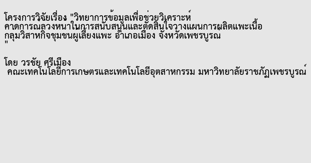 ผลการพยากรณ์ข้อมูลการเจริญเติบโตของแพะเนื้อสำหรับสร้างเป็นตัวแบบในการพยากรณ์และการพยากรณ์แพะเนื้อสายพันธุ์ผสม เปรียบเทียบระหว่าง อัลกอริทึม Linear Regression (SLR) และ Multi Linear Regression (MLR) แสดงข้อมูลแต่ละตัวเป็นจุด (Scatter) ตามอัตราการเจริญเติบโต และน้ำหนัก อัตราการฝึกสอน 80% อัตราการทดสอบ 20% เพื่อนำมาวิเคราะห์หาอัตราการเจริญเติบโตของแพะเนื้อระหว่างอายุ 0–4 เดือน 4-12 เดือน และ 12-24 เดือน อัตราการเจริญเติบโตช่วงอายุแรกเกิด 0 – 4 เดือน สายพันธุ์ บอร์-ไทยพื้นเมือง และ สายพันธุ์แองโกลนูเบียน-ไทยพื้นเมือง พบว่า 2 สายพันธุ์นี้มีการเจริญเติบโต แรกเกิด 0 เดือน จนไปถึง 4 เดือน ที่ 15-17 กิโลกรัม สายพันธุ์บอร์-โกลนูเบียน และสายพันธุ์แบล็ค แบงโก-แองโกลนูเบียน มีอัตราการเจริญเติบโตใกล้เคียงกัน อัตราการเจริญเติบโตช่วงอายุ 4 เดือน จนไปถึง 12 เดือน สายพันธุ์บอร์-ไทยพื้นเมือง มีอัตราการเจริญเติบโตระหว่าง 80-90 กิโลกรัม สายพันธุ์แองโกลนูเบียน-ไทยพื้นเมือง มีอัตราสัดส่วนที่น้อยกว่า อยู่ระหว่าง 60-70 กิโลกรัม สายพันธุ์บอร์-โกลนูเบียน 55-70 กิโลกรัม สายพันธุ์แบล็ค แบงโก-แองโกลนูเบียน มีการเจริญเติบโตระดับกระจายมากที่ 30-70 กิโลกรัม อัตราการเจริญเติบโตช่วงอายุ 12 เดือน จนไปถึง 24 เดือน สายพันธุ์บอร์-ไทยพื้นเมือง มีอัตราการเจริญเติบโตระหว่าง 60-100 กิโลกรัม สายพันธุ์แองโกลนูเบียน-ไทยพื้นเมือง มีอัตราสัดส่วนที่น้อยกว่าลงไปมาก สายพันธฺบอร์-โกลนูเบียน 85-90 กิโลกรัม สายพันธุ์แบล็ค แบงโก-แองโกลนูเบียน มีการเจริญเติบโตระดับกระจายค่อนข้างมากมากที่ 75-80 กิโลกรัม