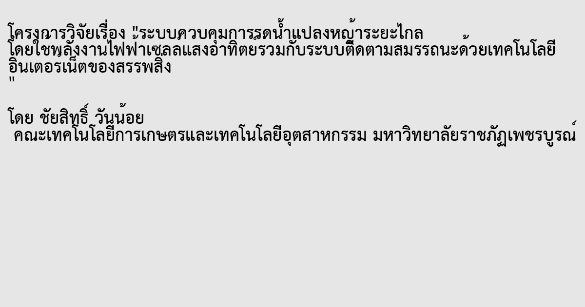 ระบบควบคุมการรดน้ำแปลงหญ้าระยะไกล โดยใช้พลังงานไฟฟ้าเซลล์แสงอาทิตย์ร่วมกับระบบติดตามสมรรถนะด้วยเทคโนโลยีอินเตอร์เน็ตของสรรพสิ่ง