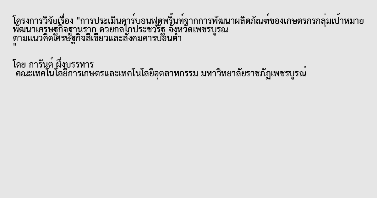 In raising the level of product carbon labeling (Carbon Label) to indicate the impact on global warming or the climate friendliness of the product between the producer and the buyer or consumer. That will cause entrepreneurs in both business and industrial sectors to pay attention to carbon footprint assessment. Conducting an assessment of greenhouse gas emissions Conducting an assessment of greenhouse gas emissions or carbon footprint of the product, which means The amount of greenhouse gases emitted throughout the product's life cycle. Along with showing carbon content information. Footprints on products or products To provide information for consumers to know. This study evaluates the carbon footprint of products using the product carbon footprint assessment method. There is the release of greenhouse gases. Calculated separately for each item as follows: Preparation of raw materials, Chinese cabbage 0.27, production process, electrical energy (blender) 0.25 and electrical energy (incubator) 0.28, total greenhouse gas emissions of 0.81 kgCO2 eq. For the paper making process, it was found that a total of 43.29 kgCO2 eq. of greenhouse gases were released, divided into 33.71 from sodium hydroxide solution, 0.25 from electrical energy (blenders) and 9.33 from gas stoves. Vegetable sheet products, raw material preparation process 0.27 kgCO2 eq. and production process 0.53 kgCO2 eq. will use high energy and therefore release greenhouse gases. More than the process of preparing objects The sodium hydroxide solution used has a production process that has high greenhouse gas emissions. In practice, greenhouse gas emissions are often caused by energy-intensive activities. Using raw materials whose production produces a lot of greenhouse gas emissions or production processes that cause greenhouse gas emissions. Reducing energy use and choosing raw materials that have a low impact on the environment can help reduce a product's carbon footprint.