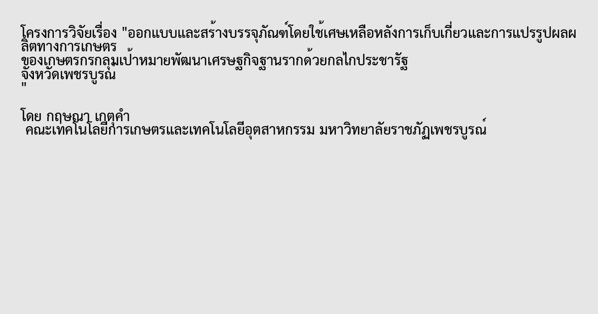 งานวิจัยนี้นาเสนอการออกแบบและสร้างบรรจุภัณฑ์โดยใช้เศษเหลือหลังการเก็บเกี่ยวและการแปรรูปผลผลิตทางการเกษตร ของเกษตรกรกลุ่มเป้าหมายพัฒนาเศรษฐกิจฐานรากด้วยกลไกประชารัฐจังหวัดเพชรบูรณ์โดยมีวัตถุประสงค์ 4 ประการได้แก่ 1)เพื่อศึกษาการขึ้นรูปกระดาษจากเศษเหลือหลังการเก็บเกี่ยวและการแปรรูปผลผลิตทางการเกษตร 2)เพื่อทดสอบการใช้งาน และความแข็งแรงของบรรจุภัณฑ์ 3)เพื่อออกแบบ และสร้างบรรจุภัณฑ์โดยใช้เศษเหลือหลังการเก็บเกี่ยวและการแปรรูปผลผลิตทางการเกษตรของเกษตรกรกลุ่มเป้าหมายพัฒนาเศรษฐกิจฐานรากด้วยกลไกประชารัฐจังหวัดเพชรบูรณ์ 4)เพื่อถ่ายทอดความรู้และเทคโนโลยีการผลิตบรรจุภัณฑ์โดยใช้เศษเหลือหลังการเก็บเกี่ยวและการแปรรูปผลผลิตทางการเกษตร ให้เกษตรกรกลุ่มเป้าหมายพัฒนาเศรษฐกิจฐานรากด้วยกลไกประชารัฐจังหวัดเพชรบูรณ์ โดยเลือกนาต้นข่าและตะไคร้ที่เป็นเศษเหลือทิ้งมาทดลองทากระดาษตามกระบวนการผลิตกระดาษขึ้นรูปกระดาษ 100 แกรม โดยทาให้เป็นเยื่อด้วยการต้มเยื่อโดยใส่โซเดียมไฮดรอกไซด์ ร้อยละ 15 ของน้าหนัก เยื่อต้ม 3 ชั่วโมง แล้วล้างเยื่อ จนเหลือแต่เส้นใย ตีเยื่อนาไปขึ้นแผ่นบนตะแกรงไนลอนขนาด 55*80 เซนติเมตร ตากให้แห้ง ลอกออก โดยแยกส่วนของใบและลาต้น เป็น 6 สูตร เมื่อได้กระดาษออกมาแล้วนาไปทดสอบปริมาณความชื้น ความต้านแรงดันทะลุของกระดาษ ทดสอบการดูดซึมน้า ทดสอบต้านแรงฉีกขาด และทดสอบความคงรูป จากผลการทดลองพบว่าคุณสมบัติของกระดาษที่ดีที่สุดคือต้นข่าและใบข่าผสมกัน มีน้าหนักมาตรฐานของกระดาษค่าเท่ากับ 201.13 แกรม มีค่าความชื้นมีค่าเท่ากับ 6.93 เปอร์เซ็นต์ ดัชนีความต้านทานแรงดึงทะลุมากที่สุด มีค่าเท่ากับ 1 กิโลกรัมต่อตารางเมตร มีความต้านทานการดูดซับน้า มีค่าเท่ากับ 304.64 แกรมต่อตารางเมตร ดัชนีความต้านทานแรงฉีกขาดมากที่สุด มีค่าเท่ากับ 33.17 นิวตันเมตร ส่วนการคงรูปของกระดาษ มีค่าเท่ากับ 1634.33 นิวตันเมตร จากคุณสมบัติภาพรวมดังกล่าวจึงนากระดาษจากต้นข่าและใบข่ามาทาเป็นบรรจุภัณฑ์ มาใช้ในการออกแบบบรรจุภัณฑ์ได้ 6 แบบ ให้ผู้เชี่ยวชาญเลือกได้บรรจุภัณฑ์แบบที่ 2 เหมาะสมที่สุด นามาสร้างบรรจุภัณฑ์ประเมินความพึงพอใจ พบว่ากลุ่มตัวอย่างมีความพึงพอใจต่อบรรจุภัณฑ์ มีค่าเฉลี่ย 4.70ความพึงพอใจอยู่ในระดับมากที่สุด นาไปถ่ายทอดความรู้และเทคโนโลยีการผลิตบรรจุภัณฑ์ให้กับกลุ่มวิทสาหกิจชุมชนบ้านน้าคาพัฒนาและประชาชนทั่วไปผลการประเมินความพึงพอใจของผู้ได้รับการอบรม อยู่ในระดับมากที่สุด ค่าเฉลี่ย 4.67