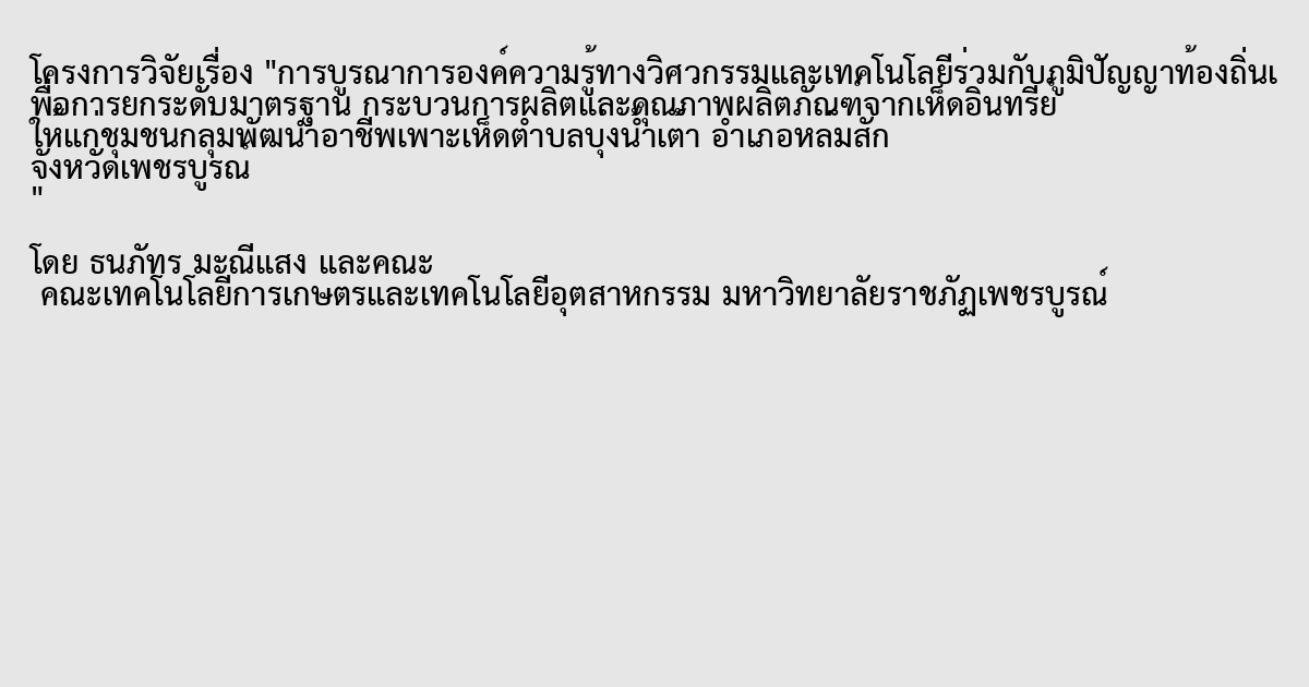 โครงงานวิจัยนี้เป็นการศึกษาการการบูรณาการองค์ความรู้ทางวิศวกรรมและเทคโนโลยีร่วมกับภูมิปัญญาท้องถิ่นเพื่อการยกระดับมาตรฐานกระบวนการผลิตและคุณภาพผลิตภัณฑ์จากเห็ดอินทรีย์ให้แก่ชุมชนกลุ่มพัฒนาอาชีพเพาะเห็ดตำบลบุ่งน้ำเต้า อำเภอหล่มสัก จังหวัดเพชรบูรณ์ ประกอบด้วย 3 กิจกรรมย่อย (โครงการวิจัยย่อย) กิจกรรมที่ 1 การปรับปรุงและพัฒนารูปแบบโรงเรือนให้เหมาะสมกับการเพาะปลูกเห็ด และบริหารจัดการระบบโรงเรือนอัจฉริยะโดยระบบ Data Management Machine Learning และ IoT สำหรับการหาสภาวะที่เหมาะสมสำหรับการเพาะปลูกเห็ดในแต่ละช่วงอายุ กิจกรรมที่ 2 การพัฒนาระบบสร้างระบบการฆ่าเชื้อก้อนเห็ดด้วยพลังงานผสม 2 ระบบ ลดระยะเวลา ลดต้นทุน สามารถควบคุมและสังเกตการณ์ได้ด้วยระบบอินเตอร์เน็ตของสรรพสิ่ง เพื่อลดปัญหาการติดเชื้อจุลินทรีย์ของก้อนเห็ด ด้วยการพัฒนาระบบกระจายความร้อน และกิจกรรมที่ 3 คือ การพัฒนาระบบฐานข้อมูลเพื่อการบริหารจัดการสำหรับจำหน่ายสินค้าในระบบมาร์เก็ตเพลสตลอดโซ่อุปทาน โดยจากผลการวิจัยพบว่า โครงการวิจัยย่อยที่1 : การออกแบบและพัฒนาสามารถทำให้เครื่องจักรสามารถทำงานได้ตามวัตถุประสงค์ที่กำหนดไว้ และระบบสามารถทำงานได้อย่างมีประสิทธิภาพ สามารถทำอุณหภูมิได้สูงสุด 100 องศาเซลเซียส ซึ่งสามารถลดเวลาอบได้สั้นลง ประมาณ 3 ชั่วโมงครึ่ง โครงการวิจัยย่อยที่2 : ระบบสามารถทำงานได้ตรงตามเงื่อนไขที่ตั้งไว้อีกทั้งข้อมูลอุณหภูมิ ความชื้น ปริมาณก๊าซคาร์บอนไดออกไซด์ การทำงานของระบบควบคุมอุณหภูมิและระบบควบคุมความชื้นทั้งหมดภายในโรงเรือนสามารถดูย้อนหลังได้จากระบบ Cloud server และสามารถดึงข้อมูลมาวิเคราะห์การเพาะปลูกเพื่อวางแผนการบริหารจัดการการเพาะปลูกเห็ดอินทรีย์ได้อีกด้วย และโครงการวิจัยย่อยที่ 3 : ในการทดลองใช้ระบบสารสนเทศในการเก็บข้อมูลด้านยอดขายเพื่อตรวจสอบการจำหน่ายผลผลิตเพื่อเตรียมพร้อมและวางแผนการผลิตเห็ด เข้าสู่ตลอดออนไลน์ โดยอาศัยการเทคโนโลยีการเก็บข้อมูลในระบบฐานข้อมูลของเกษตรกรและผู้ขายปลีกมาวิเคราะห์หาโอกาสในการเพิ่มช่องทางการจำหน่ายสินค้าออนไลน์ ซึ่งจากการประเมินผลผลิต และยอดจำหน่ายในระยะ 1 ปีจากข้อมูลที่นำเข้า พบว่ากระบวนการผลิตรูปแบบใหม่ที่นำเทคโนโลยีการควบคุมอัตโนมัติมาใช้นั้น สามารถเพิ่มประมาณผลผลิตขึ้นจากเดิม ร้อยละ 30-40 สอดคล้องกับสมมุติฐาน โดยในรอบการปลูกที่ 3 ของปีที่แล้วสามารถผลิตได้เพียง 1.5 ตันเท่านั้น แต่ในช่วงเดียวกันข้อมูลแสดงให้เห็นว่าเมื่อใช้ระบบการผลิตที่พัฒนาขึ้นสามารถเพิ่มผลผ