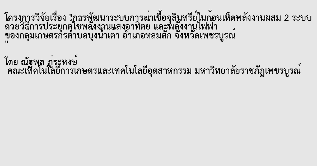 การพัฒนาระบบการฆ่าเชื้อจุลินทรีย์ในก้อนเห็ดพลังงานผสม 2 ระบบ ด้วยวิธีการประยุกต์ใช้พลังงานแสงอาทิตย์ และพลังงานไฟฟ้า ของกลุ่มเกษตรกรตำบลบุ่งน้ำเต้า อำเภอหล่มสัก จังหวัดเพชรบูรณ์