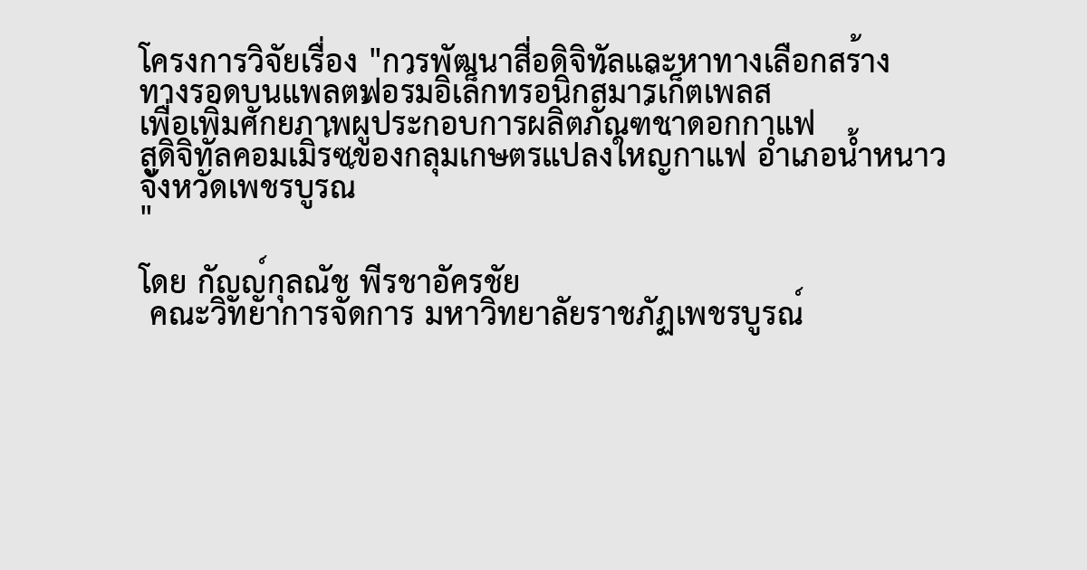 วัตถุประสงค์ในการทำวิจัยเพื่อ 1) พัฒนาสื่อดิจิทัลผลิตภัณฑ์ชาดอกกาแฟของกลุ่มเกษตรแปลงใหญ่กาแฟ อำเภอน้ำหนาว จังหวัดเพชรบูรณ์ 2) เพิ่มช่องทางการจัดจำหน่ายผลิตภัณฑ์ชาดอกกาแฟบนแพลตฟอร์มอิเล็กทรอนิกส์มาร์เก็ตเพลสของกลุ่มเกษตรแปลงใหญ่กาแฟ อำเภอน้ำหนาว จังหวัดเพชรบูรณ์ และ 3) ศึกษาความพึงพอใจสื่อดิจิทัลผลิตภัณฑ์ชาดอกกาแฟของกลุ่มเกษตรแปลงใหญ่กาแฟ อำเภอน้ำหนาว จังหวัดเพชรบูรณ์ รูปแบบการวิจัยเป็นการวิจัยและพัฒนา โดยใช้เทคนิคการวิจัยเชิงปฏิบัติการแบบมีส่วนร่วมของชุมชน กลุ่มตัวอย่างที่ใช้ศึกษา คือ สมาชิกกลุ่มเกษตรแปลงใหญ่กาแฟ จำนวน 30 คน และผู้ใช้งานทั่วไป คือ ผู้บริโภค ผู้รับชมสื่อดิจิทัล และบุคคลทั่วไปที่สนใน จำนวน 100 คน เครื่องมือวิจัยได้แก่ แบบสอบถาม แบบสัมภาษณ์ การสนทนา การอบรมถ่ายทอดเทคโนโลยีเชิงปฏิบัติการและการจัดเวทีประชาคม สำหรับการวิเคราะห์ข้อมูลทางสถิติ ได้แก่ ค่าร้อยละ ค่าเฉลี่ย ส่วนเบี่ยงเบนมาตรฐานและบรรยายเชิงพรรณนา