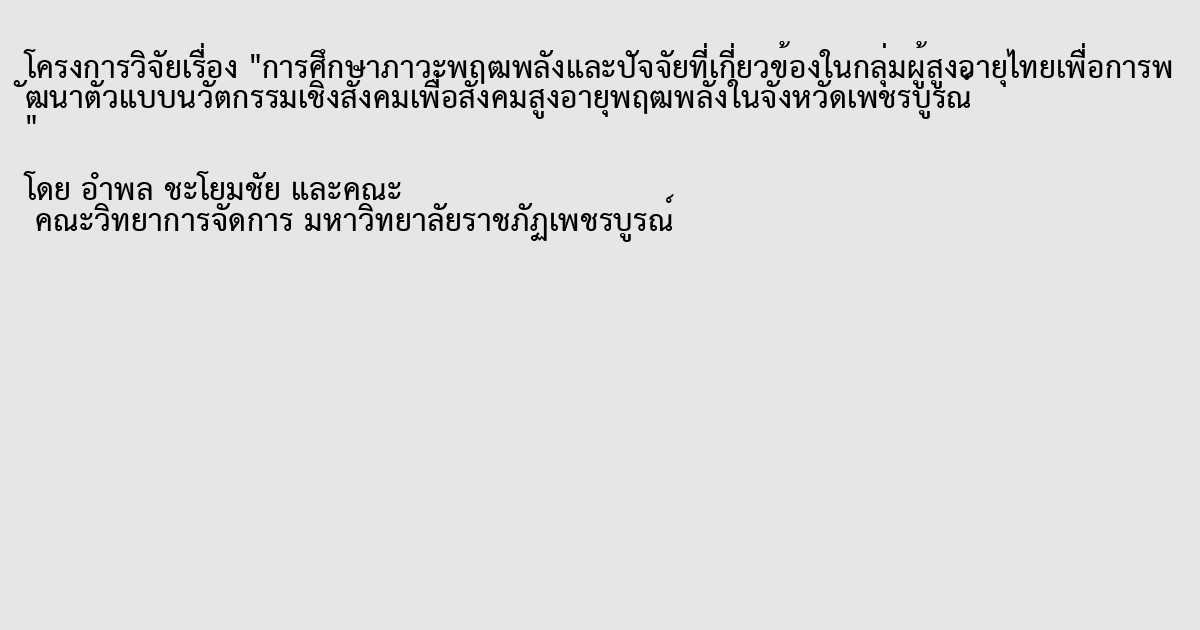 พฤฒพลัง,ผู้สูงอายุ,การพัฒนาตัวแบบใหม่,นวัตกรรมเชิงสังคม,Active Aging,Elderly,New Model Development,Social Innovation