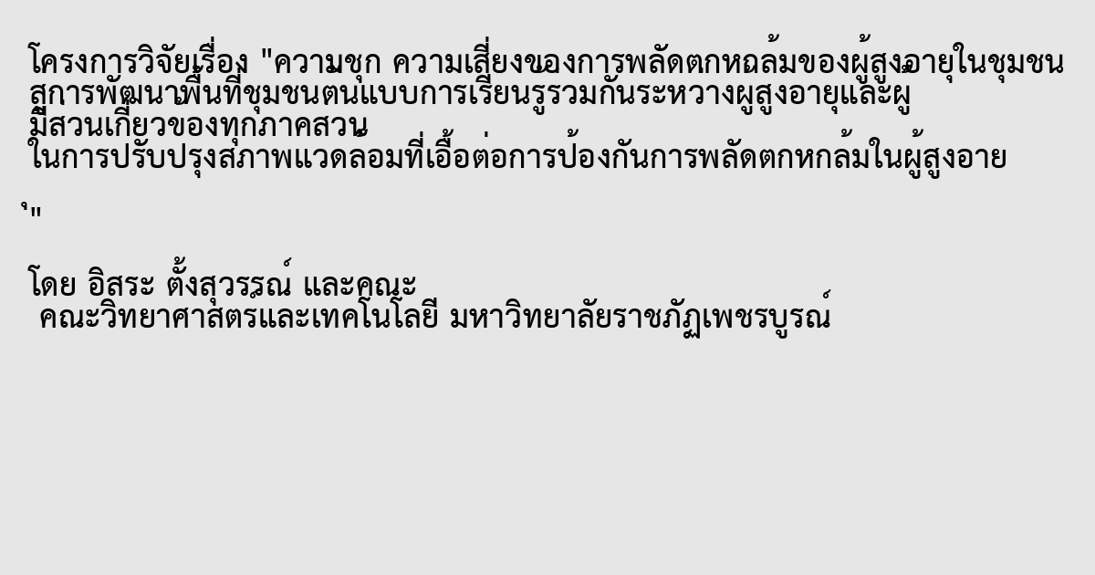 เป็นการศึกษาแบบผสมผสานวิธี (Mixed method) ทั้งเชิงปริมาณและคุณภาพ เชิงปริมาณศึกษาแบบเชิงวิเคราะห์แบบภาคตัดขวาง (Cross-sectional analytical study) มีวัตถุประสงค์เพื่อวัดความชุกและทดสอบปัจจัยเสี่ยงของการพลัดตกหกล้มในผู้สูงอายุ เครื่องมือเป็นแบบสัมภาษณ์ กลุ่มตัวอย่างเป็นผู้สูงอายุในพื้นที่ 2 ตำบล อำเภอเมือง จังหวัดเพชรบูรณ์ รวม 957 คน ใช้สถิติ Multiple binary logistic regression เพื่อทดสอบความสัมพันธ์ระหว่างปัจจัยเสี่ยงกับการพลัดตกหกล้ม