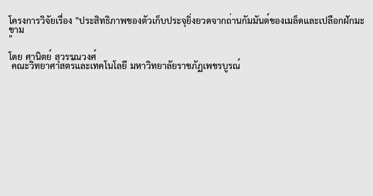 จังหวัดเพชรบูรณ์เป็นจังหวัดที่มีมะขามหวานเป็นผลไม้ทางเศรษฐกิจที่สำคัญ แต่ด้วยเศษที่เหลือจากการรับประทานเนื้อมะขามคือเมล็ดและเปลือกฝักมะขามนั้น ซึ่งเมล็ดและเปลือกฝักมะขามสามารถนำมาสังเคราะห์เป็นถ่านกัมมันต์ที่มีประโยชน์ในด้านแหล่งกักเก็บพลังงานและใช้ทำขั้วไฟฟ้าของตัวเก็บประจุยิ่งยวด ในงานวิจัยนี้ได้เพิ่มประสิทธิภาพของถ่านกัมมันต์จากเมล็ดและเปลือกฝักมะขามด้วยการผสมกับคาร์บอนแบล็คในสัดส่วนโดยน้ำหนักดังนี้ 1:4 2:3 1:1 3:2 และ 4:1 ด้วยเครื่องบดแบบลูกบอล (ball mill) จากนั้นนำไปเคลือบบนแผ่นอะลูมิเนียมฟอยล์ เพื่อใช้เป็นขั้วไฟฟ้าของตัวเก็บประจุยิ่งยวด แล้วประกอบเป็นตัวเก็บประจุยิ่งยวดแบบ coin cell