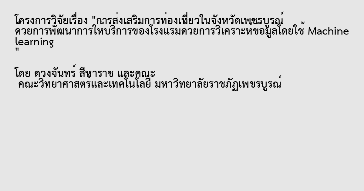 การส่งเสริมการท่องเที่ยวในจังหวัดเพชรบูรณ์ ด้วยการพัฒนาการให้บริการของโรงแรมด้วยการวิเคราะห์ข้อมูลโดยใช้ Machine learning