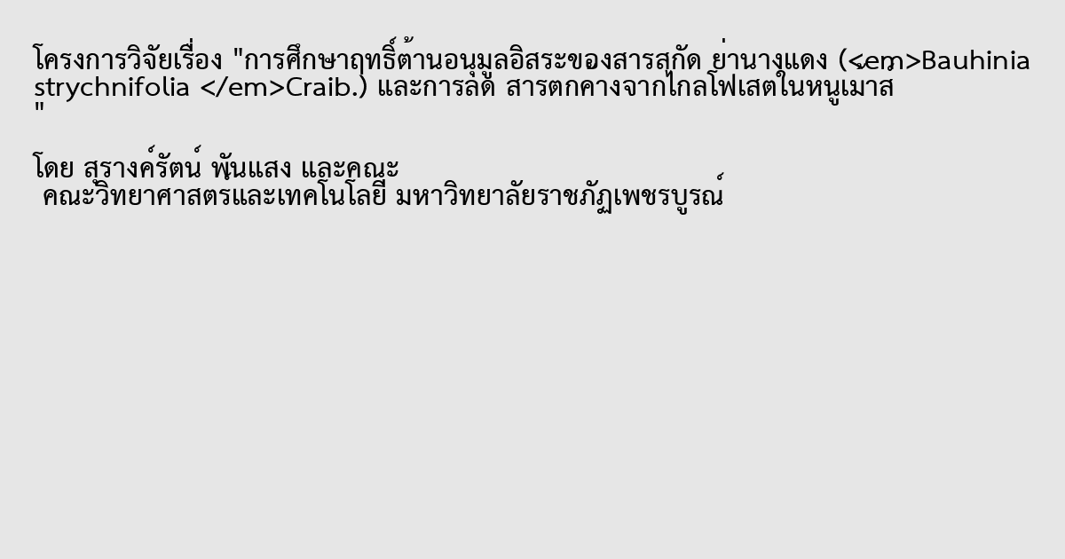 การศึกษามุ่งหมายตรวจสอบลักษณะทางสัณฐานวิทยา วิสัย และชีพลักษณ์ที่สาคัญของต้นหญ้านางแดง รวมทั้งวิเคราะห์หาสารต้านอนุมูลอิสระที่สาคัญ คือ ฟีนอลิก และฟลาโวนอยด์ รวมถึงการออกฤทธิ์ต้านทานสารอนุมูลอิสระด้วยวิธีการ DPPH assay จากสารสกัดหยาบที่ได้จากส่วนลาต้น ใบ และกิ่งก้าน ผลการศึกษาพบว่าหญ้านางแดงมีวิสัยเป็นไม้เถาเนื้อแข็ง ออกดอกในช่วงเดือนกุมภาพันธ์ ลักษณะสัณฐานที่สาคัญ คือ ลาต้นเป็นไม้ เนื้อแข็ง มีลักษณะเป็นร่องๆ สีออกเทาน้าตาล และมีมือพัน ใบเป็นใบเดี่ยว เรียงสลับ สีเขียวเข้ม ผิวใบมัน ใบมีลักษณะรูปไข่ ปลายใบมีลักษณะกลม และโคนใบเว้า ดอกเป็นแบบช่อกระจะ ดอกมีสีแดง ดอกจะออกที่บริเวณปลายกิ่ง รูปทรงกระบอกแคบ และโค้งเล็กน้อย เมื่อตรวจสอบสารพฤกษเคมีพบว่าสารสกัดของต้นหญ้านางแดงทุกส่วนมีสารฟีนอลิก ฟลาโวนอยด์ อีกทั้งยังออกฤทธิ์ในการต้านทานสารอนุมูลอิสระ สามารถยับยั้งการทางานของเอนไซม์ไทโรซิเนสได้ดี จากการตรวจสอบความเป็นพิษของสารสกัดย่านางแดง สรุปได้ว่าสารสกัดย่านางแดงไม่มีความเป็นพิษต่อหนูเมาส์และยังมีความเป็นไปได้ในการช่วยลดความเป็นพิษจากไกลโฟเสตโดยใช้ระดับความเข้มข้นของสารสกัดหญ้านางแดงที่เหมาะสม คือ 500 mg/kg