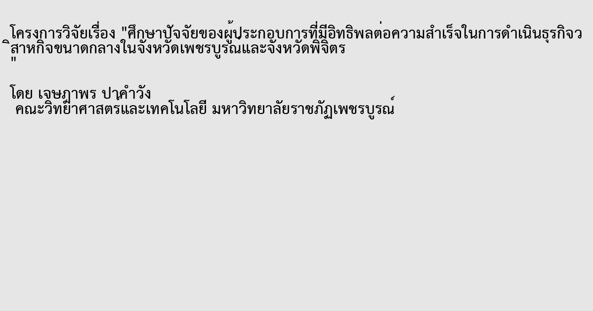 ศึกษาปัจจัยของผู้ประกอบการที่มีอิทธิพลต่อความสำเร็จในการดำเนินธุรกิจวิสาหกิจขนาดกลางในจังหวัดเพชรบูรณ์และจังหวัดพิจิตร วัตถุประสงค์เพี่อศึกษาปัจจัยของผู้ประกอบการที่มีอิทธิพลต่อความสําเร็จในการดําเนินธุรกิจวิสาหกิจขนาดกลางในจังหวัดเพชรบูรณ์และจังหวัดพิจิตรจำนวน 167 ราย คำนวณหาขนาดกลุ่มตัวอย่างโดยใช้สูตรการคำนวณค่าเฉลี่ยของประชากร ใช้วิธีการสุ่มตัวอย่างแบบแบ่งชั้นภูมิ (Stratified Random Sampling) แล้วคำนวณหาสัดส่วนของตัวอย่างแยกจังหวัดเครื่องมือที่ใช้คือแบบสอบถาม สถิติที่ใช้ได้แก่ สถิติเชิงพรรณนา ประกอบด้วยค่าความถี่ร้อยละ ค่าเฉลี่ย ส่วนเบี่ยงเบนมาตรฐาน และการทดสอบ สมมติฐานใช้การวิเคราะห์ค่าสัมประสิทธิ์สหสัมพันธ์ของเพียร์สัน (Pearson Correlation Coefficient) และการวิเคราะห์การถดถอยพหุคูณ (Multiple Regression Analysis)