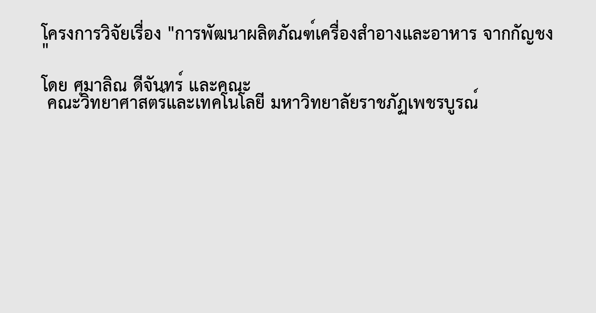 โครงการวิจัยย่อยที่ 5 ในปัจจุบันสถานการณ์ของสังคมให้ความสนใจเกี่ยวกับพืชกัญชง (Hemp) เป็นอย่างมาก เนื่องจากกัญชงเป็นพืชเศรษฐกิจชนิดใหม่ที่ได้มีประกาศจากกระทรวงสาธารณสุข และในปี พ.ศ. 2564–2565 ได้ออกกฎกระทรวงและประกาศกระทรวงเกี่ยวกับกัญชาและกัญชง 4 ฉบับ เพื่อให้สามารถนำมาใช้ประโยชน์ทางการแพทย์ รวมทั้งนำส่วนต่าง ๆ ของพืชกัญชาและกัญชงมาใช้ประโยชน์ในเชิงพาณิชย์ได้ การศึกษานี้มีวัตถุประสงค์เพื่อทดสอบฤทธิ์ต้านอนุมูลอิสระจากใบกัญชง และนำมาพัฒนาเป็นต้นแบบผลิตภัณฑ์โลชั่นบำรุงผิวพรรณจากสารสกัดใบกัญชง ซึ่งใบกัญชงที่ใช้ในการวิจัยเป็นส่วนเหลือใช้จากการปลูกกัญชงของกลุ่มวิสาหกิจชุมชน โดยนำใบสดมาผึ่งลมให้แห้งนำไปบดให้ละเอียด จากนั้นเข้าสู่ขั้นตอนการสกัดสารสำคัญด้วยเอทานอล (Ethanol extract) และตรวจหาฤทธิ์ต้านอนุมูลอิสระด้วยวิธี DPPH ผลการทดสอบพบว่า สารสกัดใบกัญชงมีความสามารถในการต้านอนุมูลอิสระที่ความเข้มข้น 1 มิลลิกรัม/มิลลิลิตร ที่ร้อยละ 38.39±0.63 โดยค่าความเข้มข้นที่สามารถต้านอนุมูลอิสระที่ร้อยละ 50 (EC50) อยู่ที่ 2.239 มิลลิกรัม/มิลลิลิตร ส่วนตรวจหาฤทธิ์ต้านอนุมูลอิสระด้วยวิธี FRAP พบว่าในสารสกัดใบกัญชง 1 มิลลิกรัม มีปริมาณสารต้านอนุมูลอิสระเทียบเท่ากับ 22.19±1.485 ไมโครกรัม แสดงให้เห็นว่าสารสกัดจากใบกัญชง มีฤทธิ์ในการต้านอนุมูลอิสระ และเหมาะสมที่จะนำพัฒนาต่อยอดเป็นผลิตภัณฑ์ต้นแบบโลชั่นบำรุงผิวพรรณ เพิ่มการต้านอนุมูลอิสระในการปกป้องผิว และช่วยเพิ่มมูลค่าเศษวัสดุเหลือใช้ทางการเกษตรของกัญชง และสามารถเป็นต้นแบบในการพัฒนาเป็นผลิตภัณฑ์อื่น ๆ ได้อย่างหลากหลายมากยิ่งขึ้น