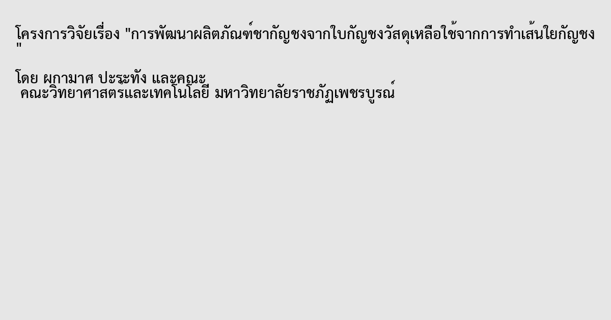 การพัฒนาผลิตภัณฑ์ชากัญชงจากใบกัญชงวัสดุเหลือใช้จากการทำเส้นใยกัญชง มีวัตถุประสงค์เพื่อทดสอบฤทธิ์ต้านอนุมูลอิสระจากใบกัญชงและพัฒนาต้นแบบผลิตภัณฑ์ชาใบกัญชง จากกัญชง สายพันธุ์ Siskiyou gold โดยใช้ยอด ใบอ่อน ใบเพสลาด และใบแก่ มาทดสอบฤทธิ์ต้านอนุมูลอิสระ ผลการวิจัยพบว่า ความสามารถในการต้านอนุมูลอิสระด้วยวิธี DPPH ใบแก่ มีค่า IC50 เท่ากับ 2.28 มิลลิกรัมต่อมิลลิลิตรมากที่สุด, วิธี ABTS ใบแก่ มีค่า IC50 เท่ากับ 0.19 มิลลิกรัมต่อมิลลิลิตรมากที่สุด และ FRAP ใบอ่อน มีค่า IC50 เท่ากับ 0.19 มิลลิกรัมต่อมิลลิลิตรมากที่สุด การวิเคราะห์ปริมาณฟีนอลิกและปริมาณฟลาโวนอยด์ พบใบเพสลาด มีปริมาณฟีนอลิก เท่ากับ 0.5491±0.0034 มากที่สุด และใบอ่อน มีปริมาณฟลาโวนอยด์ เท่ากับ 1.2226±0.0054 มากที่สุด การพัฒนาผลิตภัณฑ์ชาใบกัญชง โดยใช้ส่วนของยอด ใบอ่อน และใบเพสลาดมาพัฒนากรรมวิธีการผลิต ควบคุมปริมาณความชื้นไม่เกินร้อยละ 10 ซึ่งพบว่า กรรมวิธีการผลิตชาอู่หลง มีความชื้น ร้อยละ 8.47 น้อยที่สุด ดังนั้น การใช้ใบกัญชง สามารถใช้ใบได้ทุกส่วน ซึ่งเป็นการเพิ่มมูลค่าให้กับใบกัญชที่เหลือใช้จากการทำเส้นใยกัญชงและการตัดตกแต่งกิ่ง ก่อให้เกิดรายได้กับเกษตรกรต่อไป