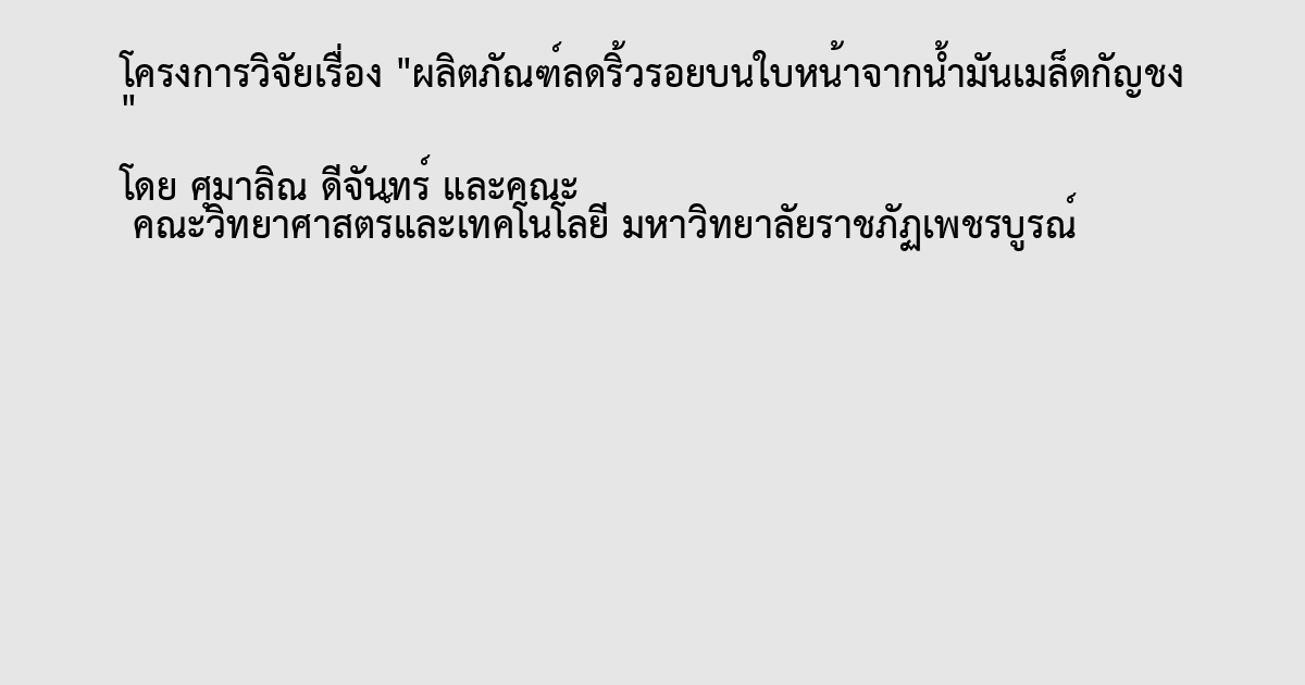 การวิจัยนี้มีวัตถุประสงค์เพื่อศึกษาคุณสมบัติของน้ำมันเมล็ดกัญชงและพัฒนาเป็นต้นแบบผลิตภัณฑ์ลดริ้วรอยบนใบหน้า โดยนำน้ำมันเมล็ดกัญชงที่ซื้อจากบริษัท ไทยสติ๊คเฮิร์บ จำกัด มาตรวจวิเคราะห์ พบว่าประกอบด้วยกรดไขมันหลายชนิด เช่น กรดปาล์มมิติก กรดสเตียริก กรด ลิโนเลอิก กรดโอเลอิก เป็นต้น ผลการวิเคราะห์วิตามินอี (Tocopherol) พบโทโคฟีรอลชนิดแอลฟา (α) ซึ่งมีคุณสมบัติช่วยปกป้องผิวจากอนุมูลอิสระ ลดการเกิดริ้วรอยก่อนวัยอันควร เมื่อพัฒนาผลิตภัณฑ์ลดริ้วรอยบนใบหน้าทำให้ได้ผลิตภัณฑ์ต้นแบบมีคุณสมบัติในการป้องกันริ้วรอยก่อนวัย ทำให้ผิวชุ่มชื้น กระจ่างใส การตรวจวิเคราะห์ผลิตภัณฑ์ต้นแบบไม่พบเชื้อที่ก่อโรค ตัวอย่างมีค่าความเป็นกรด-ด่าง เฉลี่ย 6.11 ซึ่งเป็นค่าที่มีความเหมาะสม ดังนั้น การนำน้ำมันเมล็ดกัญชงมาเป็นส่วนผสมในการผลิตภัณฑ์ลดริ้วรอยบนใบหน้าหรือเครื่องสำอางเป็นส่วนผสมที่มีคุณสมบัติเหมาะสม งานวิจัยนี้จึงสนับสนุนการใช้ประโยชน์จากน้ำมันเมล็ดกัญชง เป็นการต่อยอดผลผลิตทางการเกษตรในเชิงพาณิชย์ เพิ่มมูลค่าแก่ผลิตภัณฑ์และเป็นแนวทางขับเคลื่อนการใช้พืชสมุนไพรกัญชงให้เกิดประโยชน์ในมิติที่หลากหลายต่อไป