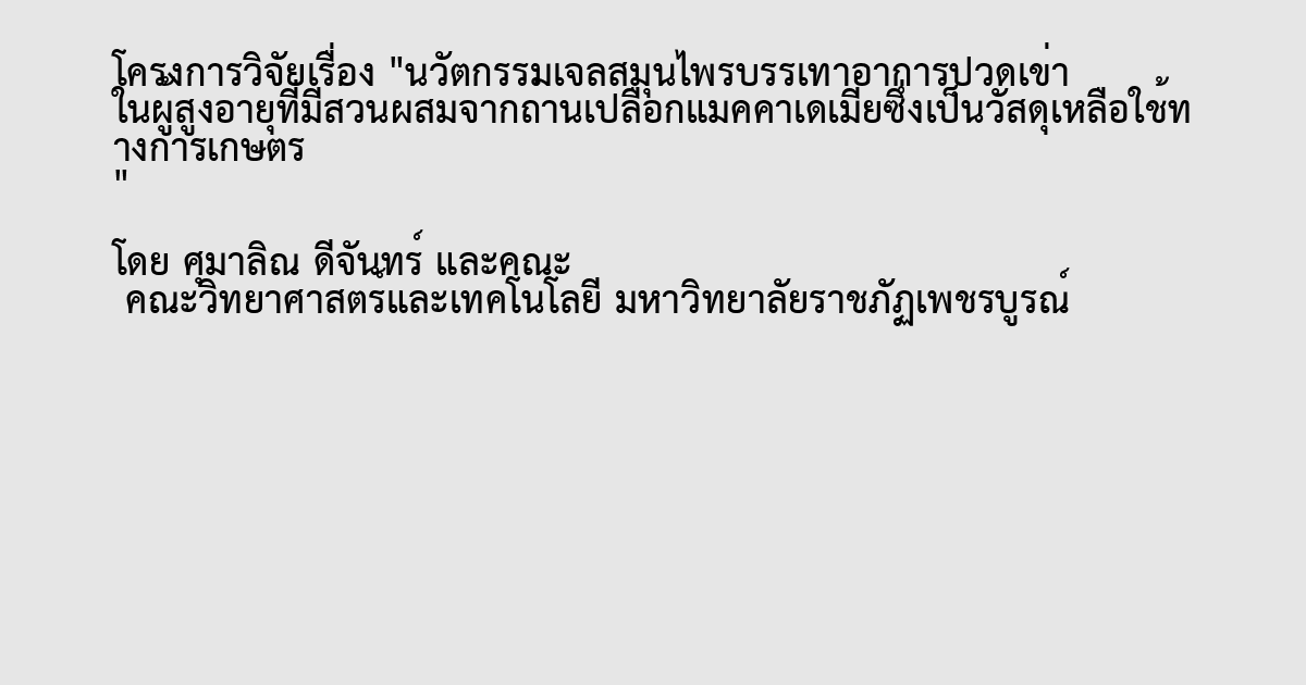 นวัตกรรมเจลสมุนไพรบรรเทาอาการปวดเข่าในผู้สูงอายุ ที่มีส่วนผสมจากถ่านเปลือก แมคคาเดเมีย ซึ่งเป็นวัสดุเหลือใช้ทางการเกษตร วัตถุประสงค์เพื่อพัฒนาพัฒนาสูตรเจลสมุนไพรที่มีส่วนผสมจากถ่านเปลือกแมคคาเดเมีย ศึกษาฤทธิ์การต้านอักเสบของสูตรตำรับยาพอกเข่า และ ถ่ายทอดเทคโนโลยีการผลิตเจลสมุนไพรที่มีส่วนผสมจากถ่านเปลือกแมคคาเดเมียให้กับผู้ประกอบการและชุมชน รูปแบบการวิจัย เป็นการวิจัยเชิงทดลอง ผลการวิจัยพบว่า สารสกัดสมุนไพรทั้ง 3 สูตร ซึ่งมีสมุนไพร เช่น ไพล ขมิ้นชัน ขิง ดองดึง เป็นต้น มีฤทธิ์ต้านการอักเสบโดยสามารถยับยั้งการสลายตัวของอัลบูมิน สารสกัดสมุนไพรสูตรที่ 3, สารสกัดสมุนไพรสูตรที่ 1 และสารสกัดสมุนไพรสูตรที่ 2 มีค่า IC50 เท่ากับ 7.39, 9.08 และ12.02 ตามลำดับ และมีฤทธิ์ต้านการอักเสบในหลอดทดลองเป็น 0.06, 005, 0.04 เท่าของ Diclofenac diethylammonium ตามลำดับ การพัฒนาผลิตภัณฑ์ต้นแบบเจลสมุนไพรที่มีส่วนผสมของผงถ่านเปลือกแมคคาเดเมีย ได้นำสารสกัดสมุนไพรสูตรที่ 3 ซึ่งประกอบด้วย ไพล ขมิ้นชัน และขิง มาพัฒนาผลิตภัณฑ์ต้นแบบ ร่วมกับการใช้แซนแทนกัมเป็นสารก่อเจล และผงถ่านเปลือกแมคคาเดเมีย จากนั้นนำผลิตภัณฑ์ไปทดสอบฤทธิ์ต้านการอักเสบ พบว่ามีความสามารถยับยั้งการสลายตัวของอัลบูมิน มีค่า IC50 เท่ากับ 3.05 และมีฤทธิ์ต้านการอักเสบในหลอดทดลองเป็น 0.15 เท่าของ Diclofenac diethylammonium และถ่ายทอดความรู้และเทคโนโลยีสู่วิสาหกิจชุมชนผู้ผลิตและแปรรูปแมคคาเดียเมียเขาค้อ และผู้สูงอายุในตำบลเข็กน้อย อ.เขาค้อ จ.เพชรบูรณ์ เพื่อพัฒนาต่อยอดเป็นผลิตภัณฑ์ชุมชนต่อไป