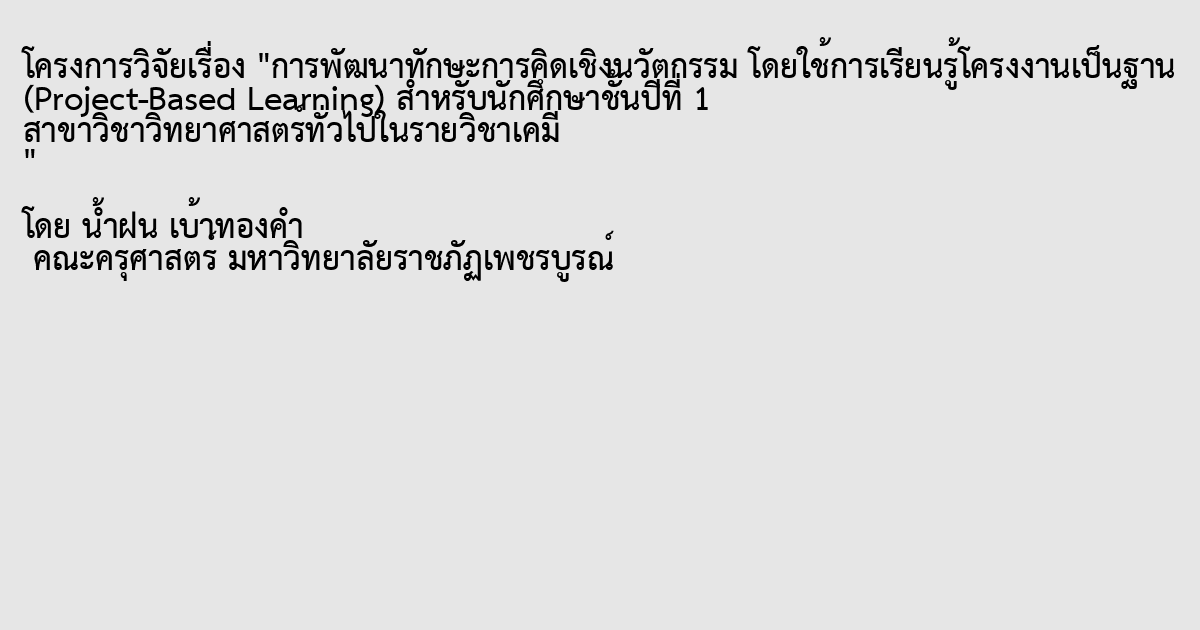การพัฒนาทักษะการคิดเชิงนวัตกรรม โดยใช้การเรียนรู้โครงงานเป็นฐาน (Project-Based Learning) สำหรับนักศึกษาชั้นปีที่ 1 สาขาวิชาวิทยาศาสตร์ทั่วไปในรายวิชาเคมี