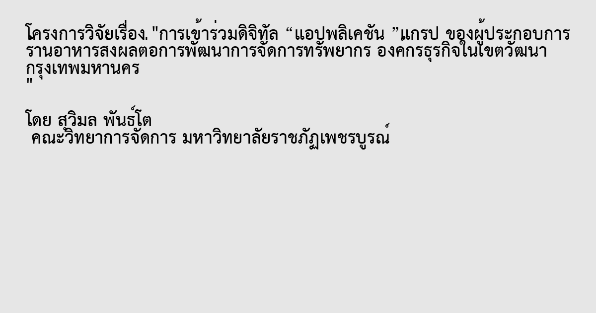 การเข้าร่วมดิจิทัล “แอปพลิเคชัน ”แกรป ของผู้ประกอบการ ร้านอาหารส่งผลต่อการพัฒนาการจัดการทรัพยากร องค์กรธุรกิจในเขตวัฒนา กรุงเทพมหานคร