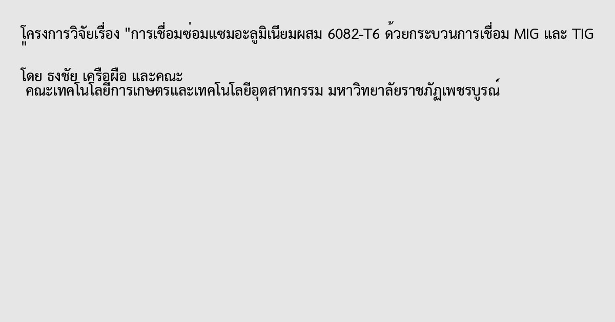 อลูมิเนียมอัลลอยด์ 6082-T6,การเชื่อมซ่อม,คุณสมบัติทางกล,รอยเชื่อม MIG,รอยเชื่อม TIG,6082-T6 aluminum alloy,Repair welding,Mechanical properties,MIG welded joints,TIG welded joints