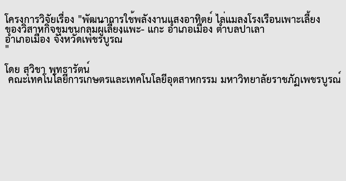 พัฒนาการใช้พลังงานแสงอาทิตย์ ไล่แมลงโรงเรือนเพาะเลี้ยง ของวิสาหกิจชุมชนกลุ่มผู้เลี้ยงแพะ- แกะ อำเภอเมือง ตำบลป่าเลา อำเภอเมือง จังหวัดเพชรบูรณ์