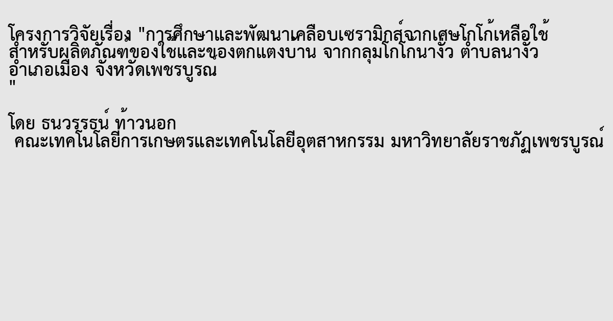 การศึกษาและพัฒนาเคลือบเซรามิกส์จากเศษโกโก้เหลือใช้ สำหรับผลิตภัณฑ์ของใช้และของตกแต่งบ้าน จากกลุ่มโกโก้นางั่ว ตำบลนางั่ว อำเภอเมือง จังหวัดเพชรบูรณ์