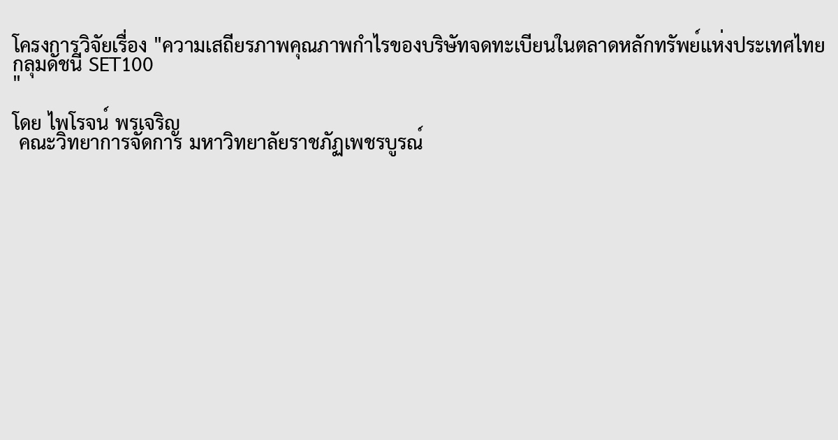ความเสถียรภาพคุณภาพกำไรของบริษัทจดทะเบียนในตลาดหลักทรัพย์แห่งประเทศไทย กลุ่มดัชนี SET100