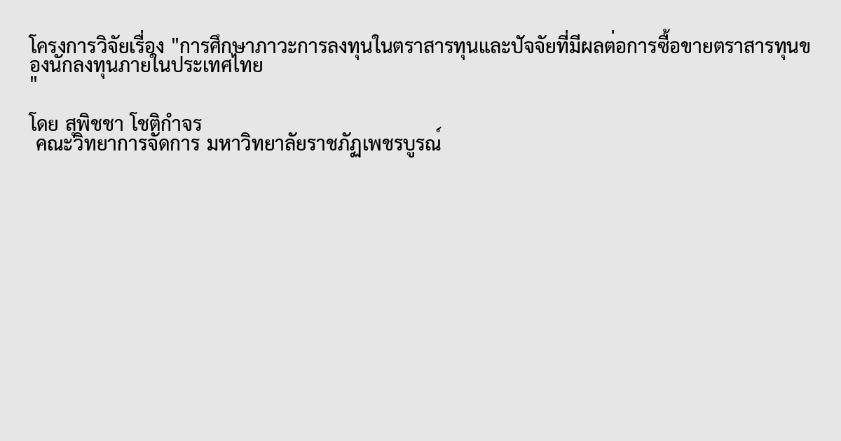 การวิจัยครั้งนี้มีวัตถุประสงค์คือ 1) เพื่อศึกษาสถานการณ์การลงทุนในตราสารทุนของนักลงทุนภายในประเทศผ่านตลาดหลักทรัพย์แห่งประเทศไทย และ 2) เพื่อศึกษาปัจจัยที่มีผลต่อการซื้อขายตราสารทุนของนักลงทุนภายในประเทศผ่านตลาดหลักทรัพย์แห่งประเทศไทย โดยวิธีดำเนินการวิจัยจะเป็นรูปแบบเชิงปริมาณ ใช้ข้อมูลทุติยภูมิรายเดือน ตั้งแต่เดือนมกราคม พ.ศ.2559 ถึงเดือนตุลาคม พ.ศ.2564 จำนวน 70 เดือน และใช้แบบจำลอง Autoregressive Distributed Lag ในการวิเคราะห์ข้อมูล