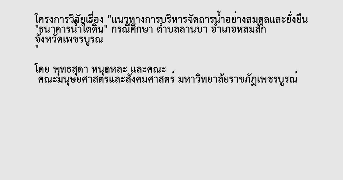 การวิจัยเรื่อง แนวทางในการบริหารจัดการน้ำอย่างยั่งยืน “ธนาคารน้ำใต้ดิน” กรณีศึกษา ตำบลลานบ่า อำเภอหล่มสัก จังหวัดเพชรบูรณ์ ครั้งนี้มี วัตถุประสงค์การวิจัย ดังนี้ ประการที่ 1 วิจัย (1) เพื่อศึกษาการบริหารจัดการน้ำโดยใช้รูปแบบธนาคารน้ำใต้ดิน ในพื้นที่ ตำบลลานบ่า อำเภอหล่มสัก จังหวัดเพชรบูรณ์ (2) เพื่อศึกษาปัญหา อุปสรรค ในการดำเนินการบริหารจัดการน้ำใต้ดินแบบธนาคารน้ำใต้ดินดิน ในพื้นที่ ตำบลลานบ่า อำเภอหล่มสัก จังหวัดเพชรบูรณ์ (3) เพื่อศึกษาแนวทางการในการบริหารจัดการน้ำอย่างสมดุลและยั่งยืนโดยใช้รูปแบบธนาคารน้ำใต้ดิน เพื่อแก้ปัญหาภัยแล้งและแก้ไขปัญหาน้ำท่วม ตำบลลานบ่า อำเภอหล่มสัก จังหวัดเพชรบูรณ์ การวิจัยครั้งนี้เป็นการวิจัยเชิงคุณภาพ (qualitative research) โดยการวิจัยเอกสาร (documentary research) การสัมภาษณ์เชิงลึก (in-depth-interview) บุคคลที่เกี่ยวข้อง การสังเกตแบบไม่มีส่วนร่วม (non-participant observation) สภาพแวดล้อมทั่วไปรวมถึงลักษณะกายภาพทั่วไปของพื้นที่และชีวิตความเป็นอยู่ของประชาชนในเขตพื้นที่วิจัย รวมทั้งการสนทนากลุ่ม (focus group) สามารถ สรุป อภิปรายผล และข้อเสนอแนะผลการวิจัยพบว่า