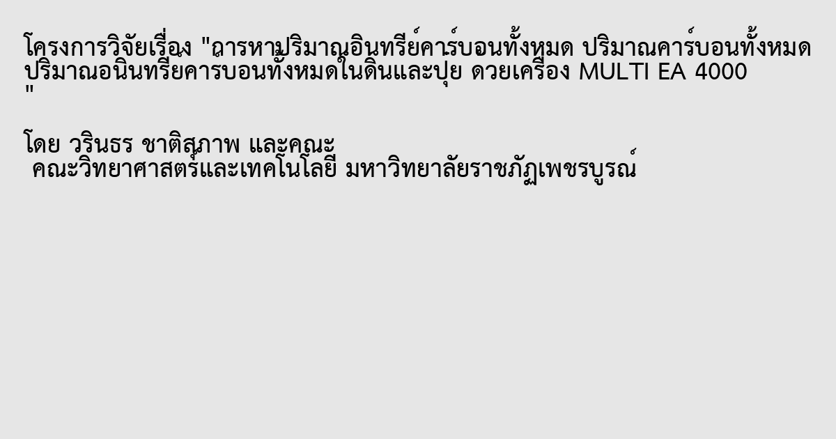 การวิจัยครั้งนี้มีวัตถุประสงค์เพื่อ เพื่อศึกษาวิธีการใช้ เครื่อง MULTI EA 4000 ให้ทราบหาปริมาณอินทรีย์คาร์บอนทั้งหมด (TOC) ปริมาณคาร์บอนทั้งหมด (TC) และปริมาณ อนินทรีย์คาร์บอนทั้งหมด (TIC) ในดินและปุ๋ย เครื่อง MULTI EA 4000 ไว้เป็นแนวทางให้นักวิทยาศาสตร์มีความเชี่ยวชาญในการใช้งานเครื่องมือสาหรับการตรวจวิเคราะห์รายการทดสอบปริมาณอินทรีย์คาร์บอนทั้งหมด (TOC) ปริมาณคาร์บอนทั้งหมด (TC) และปริมาณอนินทรีย์คาร์บอนทั้งหมด (TIC) ในดินและปุ๋ย