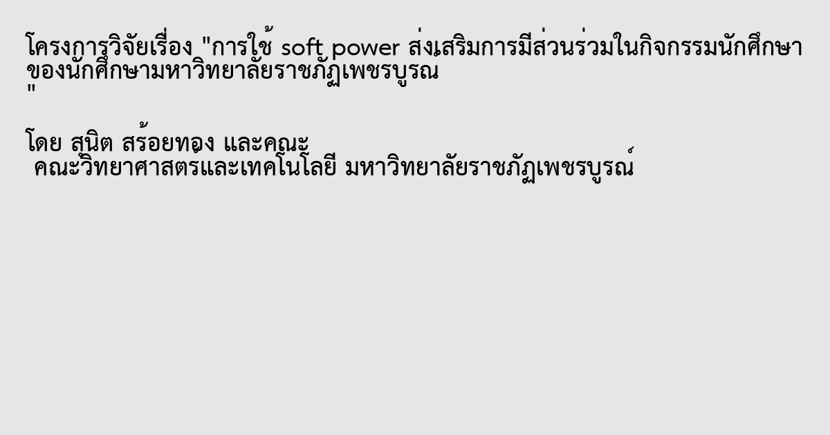 การวิจัยครั้งนี้มีวัตถุประสงค์เพื่อ 1) ศึกษาปัจจัย soft power ที่เป็นส่วนส่งเสริมการมีส่วนร่วมในกิจกรรมนักศึกษา และ 2) เพื่อเป็นแนวทางในการวางนโยบายโดยนำ soft power เป็นส่วนในการกระตุ้นการมีส่วนร่วมในการทำกิจกรรมของนักศึกษามหาวิทยาลัยราชภัฏเพชรบูรณ์ กลุ่มตัวอย่างคือ นักศึกษามหาวิทยาลัยราชภัฏเพชรบูรณ์ ชั้นปีที่ 1-3 จำนวน 344 คน ได้มาโดยการสุ่มแบบแบ่งชั้นภูมิตามสัดส่วน เครื่องมือที่ใช้เป็นแบบสอบถามแบบมาตราส่วนประมาณค่า 5 ระดับ ที่มีค่าความเชื่อมั่น .89 วิเคราะห์ข้อมูลโดยใช้ค่าความถี่ ร้อยละ ค่าเฉลี่ย ส่วนเบี่ยงเบนมาตรฐาน การทดสอบที และการวิเคราะห์ความแปรปรวนทางเดียว ผลการวิจัยพบว่า ด้านการใช้ soft power ในการส่งเสริมการมีส่วนร่วมในกิจกรรมนักศึกษาโดยรวมอยู่ในระดับมาก (x̄ = 4.07) เมื่อพิจารณารายด้านพบว่า ด้านแรงจูงใจในการเข้าร่วมกิจกรรมมีค่าเฉลี่ยสูงสุด (x̄ = 4.19) รองลงมาคือด้านอิทธิพลการส่งต่อสืบสานงานกิจกรรม (x̄ = 4.11) และด้านวัฒนธรรมองค์กร-แบบแผนการจัดกิจกรรม (x̄ = 3.92) และด้านผลการเปรียบเทียบความคิดเห็นของนักศึกษาจำแนกตามเพศและคณะไม่พบความแตกต่าง แต่พบความแตกต่างระหว่างชั้นปีในด้านอิทธิพลการส่งต่อสืบสานงานกิจกรรม โดยนักศึกษาชั้นปีที่ 1 มีค่าเฉลี่ยสูงกว่าชั้นปีที่ 2 และ 3 อย่างมีนัยสำคัญทางสถิติที่ระดับ .05 ข้อเสนอแนะจากการวิจัย มหาวิทยาลัยควรกำหนดนโยบายส่งเสริมการใช้ soft power ในการจัดกิจกรรมนักศึกษา โดยเน้นการสร้างแรงจูงใจและการพัฒนาระบบพี่เลี้ยงในการถ่ายทอดประสบการณ์ระหว่างรุ่น รวมทั้งปรับปรุงวัฒนธรรมองค์กรและแบบแผนการจัดกิจกรรมให้มีความยืดหยุ่นและตอบสนองความต้องการของนักศึกษามากขึ้น