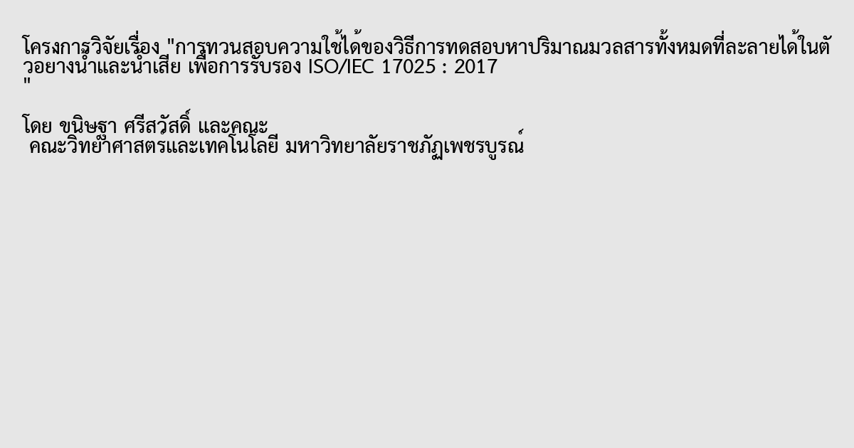 เพื่อให้ได้ผลการทดสอบที่มีความถูกต้อง แม่นยำ เชื่อถือได้ และเป็นที่ยอมรับตามมาตรฐานสากล ISO/IEC 17025 : 2017 ห้องปฏิบัติการจำเป็นต้องมีการทวนสอบความใช้ได้ของวิธีการทดสอบ โดยห้องปฏิบัติการทดสอบศูนย์วิทยาศาสตร์ คณะวิทยาศาสตร์และเทคโนโลยี มหาวิทยาลัยราชภัฏเพชรบูรณ์ ได้เลือกใช้วิธีทดสอบตาม Standard methods for the examination of water and wastewater Part 2540 C.Total Dissolved Solids dried at 180°C เพื่อทวนสอบความใช้ได้ของวิธีทดสอบหาปริมาณมวลสารทั้งหมดที่ละลายได้ในตัวอย่างน้ำและน้ำเสีย ที่ช่วงการวัด 50 – 3,000 มิลลิกรัมต่อลิตร โดยทำการตรวจสอบคุณลักษณะต่าง ๆ ดังนี้ 1) ตรวจสอบความแม่นยำของการวิเคราะห์ (Accuracy) ที่ระดับ ต่ำ กลางและสูง 2)ตรวจสอบความเที่ยง (Precision) ของการวิเคราะห์แบบทำซ้ำ โดยจากการทวนสอบความใช้ได้ของวิธีพบว่า 1)การทวนสอบความแม่นยำของวิธีการวิเคราะห์ (Accuracy ) ที่ระดับความเข้มข้น ต่ำ 50 mg/l กลาง 1500 mg/l และสูง 3000 mg/l มี % Recovery อยู่ที่ 104 101 และ 98 ตามลำดับ 2)การทดสอบความเที่ยงของวิธีการวิเคราะห์ (Precision ) ที่ 50 mg/l 1500 mg/l และที่ 3000 mg/l มี % RSD อยู่ที่ 2.53 0.46 และ 0.63 ตามลำดับ ซึ่งผ่านเกณฑ์การยอมรับทุกรายการ จึงเป็นหลักฐานยืนยันได้ว่าวิธีการทดสอบหาปริมาณมวลสารทั้งหมดที่ละลายได้ในตัวอย่างน้ำและน้ำเสีย ที่ช่วงความเข้มข้น 50-3000 mg/l ตามวิธีทดสอบนี้มีความถูกต้องและเหมาะสม