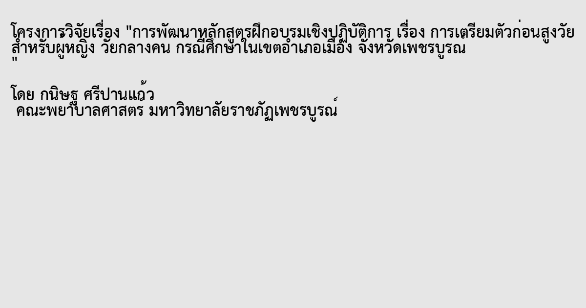 การพัฒนาหลักสูตรฝึกอบรมเชิงปฏิบัติการ เรื่อง การเตรียมตัวก่อนสูงวัย สำหรับผู้หญิง วัยกลางคน กรณีศึกษาในเขตอำเภอเมือง จังหวัดเพชรบูรณ์