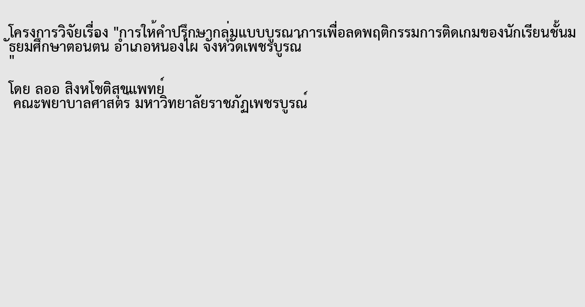 การให้คำปรึกษากลุ่มแบบบูรณาการเพื่อลดพฤติกรรมการติดเกมของนักเรียนชั้นมัธยมศึกษาตอนต้น อำเภอหนองไผ่ จังหวัดเพชรบูรณ์
