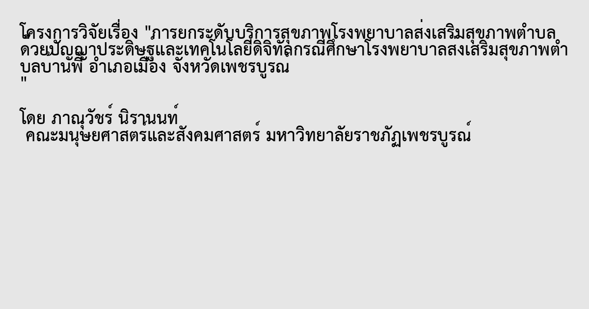 การวิจัยนี้มีวัตถุประสงค์เพื่อศึกษาแนวทางการยกระดับบริการสุขภาพของโรงพยาบาลส่งเสริมสุขภาพตำบลบ้านพี้ด้วยปัญญาประดิษฐ์และเทคโนโลยีดิจิทัล รวมถึงวิเคราะห์ผลกระทบของเทคโนโลยีดังกล่าวต่อคุณภาพการให้บริการและประสบการณ์ของผู้รับบริการ ตลอดจนเปรียบเทียบประสิทธิภาพของโมเดลภาษาขนาดใหญ่ในการตอบคำถามด้านสุขภาพที่พบบ่อย การศึกษานี้ใช้ระเบียบวิธีวิจัยแบบผสมผสาน (Mixed-Methods Research) ประกอบด้วยการเก็บข้อมูลเชิงปริมาณจากแบบสอบถามและการวิเคราะห์ข้อมูลเชิงคุณภาพจากการสัมภาษณ์เชิงลึก กลุ่มตัวอย่างประกอบด้วยบุคลากรทางการแพทย์ ผู้ใช้บริการ และผู้เชี่ยวชาญด้านสุขภาพและเทคโนโลยี รวมทั้งสิ้น 792 คน โดยใช้วิธีการสุ่มแบบชั้นภูมิและการเลือกตัวอย่างแบบเจาะจง