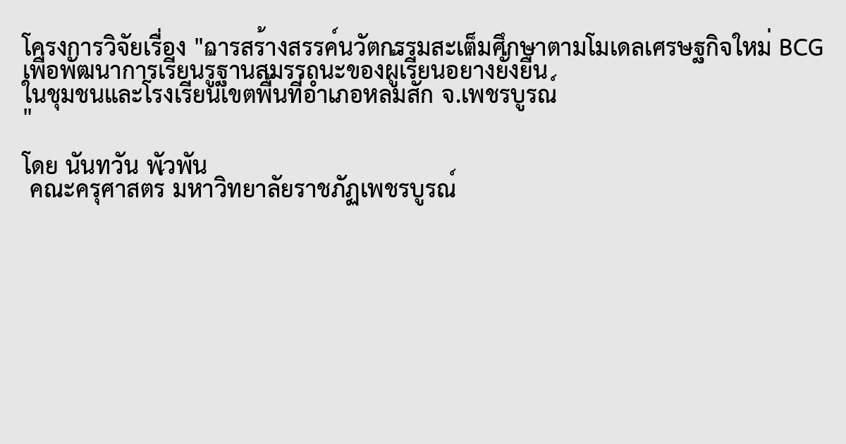 การสร้างสรรค์นวัตกรรมสะเต็มศึกษาตามโมเดลเศรษฐกิจใหม่ BCG เพื่อพัฒนาการเรียนรู้ฐานสมรรถนะของผู้เรียนอย่างยั่งยืน ในชุมชนและโรงเรียนเขตพื้นที่อำเภอหล่มสัก จ.เพชรบูรณ์