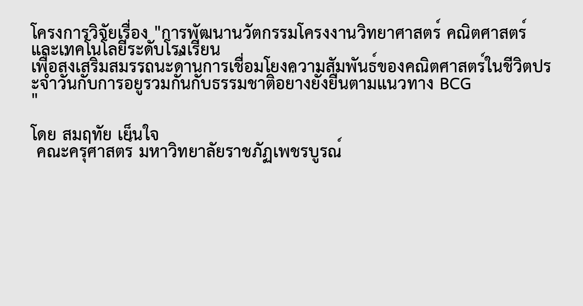 การพัฒนานวัตกรรมโครงงานวิทยาศาสตร์ คณิตศาสตร์ และเทคโนโลยีระดับโรงเรียน เพื่อส่งเสริมสมรรถนะด้านการเชื่อมโยงความสัมพันธ์ของคณิตศาสตร์ในชีวิตประจำวันกับการอยู่ร่วมกันกับธรรมชาติอย่างยั่งยืนตามแนวทาง BCG