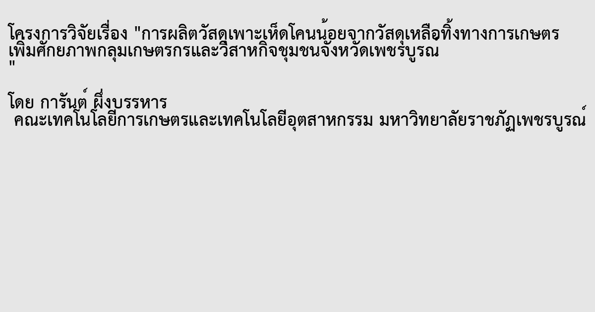 การเพาะเห็ดในประเทศไทยส่วนใหญ่ใช้ขี้เลื่อยไม้ยางพาราเป็นวัสดุเพาะในถุงพลาสติก โดยมีปริมาณการผลิตเห็ดต่อปีประมาณ 120,000 ตัน อย่างไรก็ตาม วิธีนี้ส่งผลให้เกิดขยะจากวัสดุเพาะที่ใช้แล้ว (Spent Mushroom Substrate: SMS) ในปริมาณมาก ซึ่งมักถูกทิ้งหรือใช้เป็นปุ๋ยอินทรีย์เพียงเล็กน้อย ทาให้เกิดปัญหาสิ่งแวดล้อม การศึกษานี้มุ่งประเมินศักยภาพของ SMS จากเห็ดนางฟ้า (Pleurotus ostreatus) ในการใช้เป็นวัสดุเพาะทางเลือกสาหรับการเพาะเห็ดโคนน้อย (Coprinopsis radiata) ภายใต้แนวคิดเศรษฐกิจหมุนเวียน สูตรวัสดุเพาะ 5 สูตรที่มีสัดส่วนขี้เลื่อยไม้ยางพารา (SD) และ SMS แตกต่างกัน (100:0, 75:25, 50:50, 25:75 และ 0:100) ถูกทดสอบโดยใช้การออกแบบทดลองแบบสุ่มสมบูรณ์ (Completely Randomized Design: CRD) ผลการทดลองพบว่าไม่มีความแตกต่างอย่างมีนัยสาคัญทางสถิติในจานวนดอกเห็ด ความยาวก้าน และประสิทธิภาพทางชีวภาพของเห็ดในแต่ละสูตร อย่างไรก็ตาม สูตรที่มีสัดส่วน SD และ SMS สมดุลกัน (SD75%:SMS25% และ SD50%:SMS50%) ให้ผลผลิตสดสูงสุดในช่วง 1–10 วันแรกของการเพาะปลูก โดยมีผลผลิต 72.05 กรัม และ 72.16 กรัม ตามลาดับ ในขณะที่สูตร SD100%:SMS0% ให้ดอกเห็ดที่มีขนาดหมวกใหญ่ที่สุดที่ 1.31 ซม.